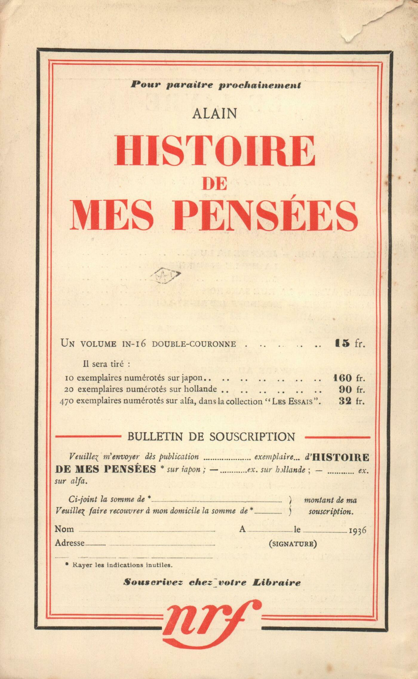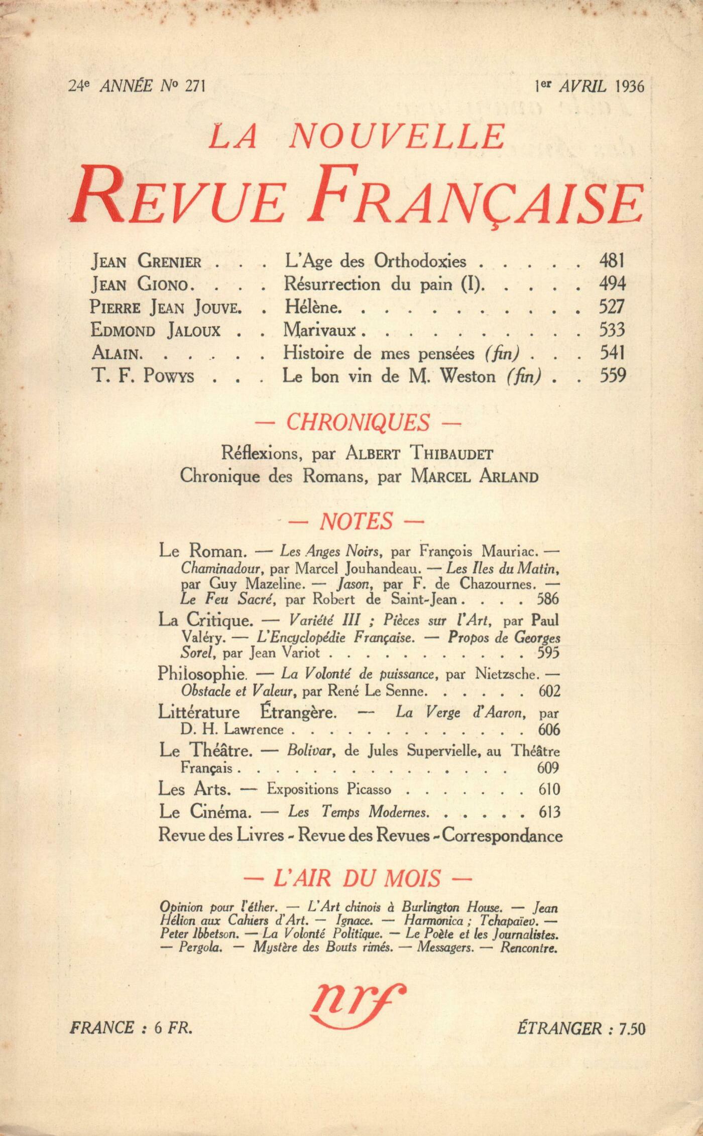 Jean Grenier, L'Âge des orthodoxiesJean Giono, Résurrection du pain (I)Pierre Jean Jouve, HélčneEdmond Jaloux, Marivaux Alain, Histoire de mes pensées (Fin)Theodore Francis Powys, Le bon vin de M. Weston (Fin)Réflexions : Albert Thibaudet, Attention ŕ l'uniqueChronique des romans : Marcel Arland, Les Anges noirs, par François Mauriac - Chaminadour, par Marcel Jouhandeau - Les îles du matin, par Guy Mazeline - Jason, par Félix de ChazournesNotes : le roman : Julien Green, Le Feu sacré, par Robert de Saint Jean (Éditions de la N. R. F.)Notes : la critique : Émilie Noulet, Variété III, par Paul Valéry (Éditions de la N. R. F.) - Pičces sur l'art, par Paul Valéry (Éditions de la N. R. F.)Jean Prévost, Encyclopédie française, XVI et XVIIRoger Caillois, Propos de Georges SorelNotes : la philosophie : Jean Prévost, La Volonté de Puissance, par Friedrich Nietzsche (Éditions de la N. R. F.)Gaston Berger, Obstacle et valeur, par René Le Senne (Aubier)Notes : lettres étrangčres : Jacques Debű-Bridel, La verge d'Aaron, par D. H. Lawrence (N. R. F.)Notes : le théâtre : Jean Guérin, Bolivar, de Jules Supervielle (Comédie-Française)Notes : les arts : André Lhote, Expositions PicassoNotes : cinéma : Denis Marion, Les Temps ModernesRevue des livres : Jean Guérin, Le Balai de sorcičre, par Armand Lunel (Gallimard) - Les Massacres de Paris, par Jean Cassou (Gallimard) - Miroirs, par Philippe Hériat (Denoël et Steele)Jean Vaudal, Mollenard, par O.-P. Gilbert (N. R. F.)Jean Guérin, L'Irrésistible, par André Fraigneau (Gallimard)Eugčne Dabit, Voilŕ taxi, par Simonin Bazin (Gallimard)Jean Guérin, La vie de famille, par Pascal Rose (Gallimard)Henri Pourrat, Le centre du monde, par Jean Bassan (Gallimard)Les revues : Jean Schlumberger, Devoirs d'une revueAndré Gide, Un sujet d'enquęteRené Bazin, Lakanal Anonymes, MémentoCorrespondance : Paul Léautaud, Lettre ŕ Jean PaulhanL'air du mois : Paul Claudel, Opinion pour l'éther Étiemble, L'art chinois ŕ Burlington HouseRaymond Queneau, Jean Hélion aux ŤCahiers d'ArtťAdrienne Monnier, IgnaceMarcel Arland, Harmonica et TchapaďevJean Vaudal, Un film de Hathaway : Peter IbbetsonPierre Hamp, La volonté politiqueA. Rolland de Renéville, Le počte et les journalistesCharles-Albert Cingria, PergolaTristan Derčme, Les propos de M. Polyphčme Durand : Mystčres des bouts-rimésJacques Delamain, MessagersHenri Pourrat, Rencontre