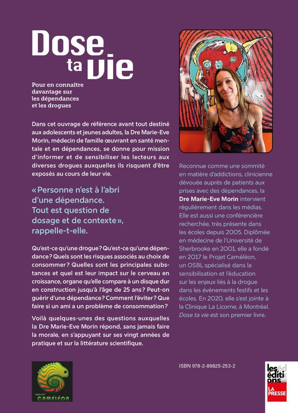 Dans cet ouvrage de référence avant tout destiné aux adolescents et jeunes adultes, la Dre Marie-Eve Morin, médecin de famille œuvrant en santé mentale et en dépendances, se donne pour mission d’informer et de sensibiliser les lecteurs aux diverses drogues auxquelles ils risquent d’être exposés au cours de leur vie.« Personne n’est à l’abri d’une dépendance. Tout est question de dosage et de contexte », rappelle-t-elle.Qu’est-ce qu’une drogue ? Qu’est-ce qu’une dépendance ? Quels sont les risques associés au choix de consommer ? Quelles sont les principales substances et quel est leur impact sur le cerveau en croissance, organe qu’elle compare à un disque dur en construction jusqu’à l’âge de 25 ans ? Peut-on guérir d’une dépendance ? Comment l’éviter ? Que faire si un ami a un problème de consommation ? Voilà quelques-unes des questions auxquelles la Dre Marie-Eve Morin répond, sans jamais faire la morale, en s’appuyant sur ses vingt années de pratique et sur la littérature scientifique.