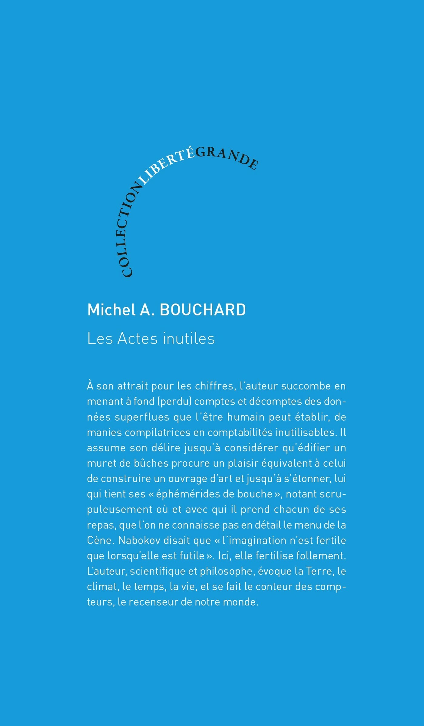 Dans cette suite d’essais tout sauf ordinaires, Michel A. Bouchard se fait le conteur des compteurs, le recenseur de notre monde. Si une telle ferveur pour les chiffres et les données impressionne, elle n’a d’égale qu’un amour pour une planète dont l’infinie beauté se révèle dans tous ces hasards, coïncidences et petits riens sur lesquels l’humain, malgré ses talents de grand destructeur, n’a aucune prise. La chute d’une tuile du haut d’un hôtel devient ainsi prétexte à réfléchir aux météorites et aux grandes extinctions, et l’achat d’un cerisier japonais à la pépinière du coin ouvre une perspective sur l’évolution du climat depuis douze siècles.