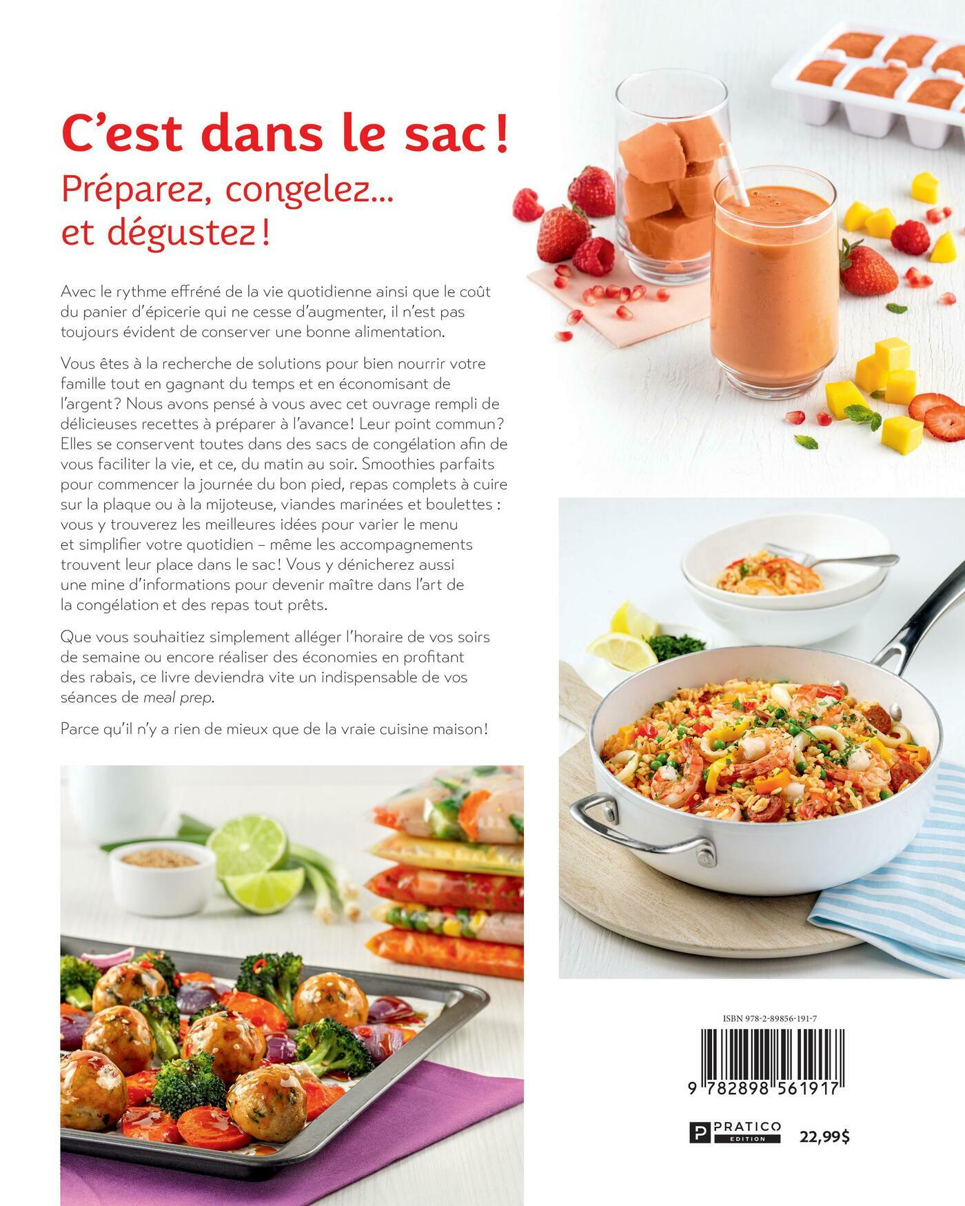 Avec le rythme effréné de la vie quotidienne ainsi que le coût du panier d’épicerie qui ne cesse d’augmenter, il n’est pas toujours évident de conserver une bonne alimentation. Vous êtes à la recherche de solutions pour bien nourrir votre famille tout en gagnant du temps et en économisant de l’argent ? Nous avons pensé à vous avec cet ouvrage rempli de délicieuses recettes à préparer à l’avance ! Leur point commun ? Elles se conservent toutes dans des sacs de congélation afin de vous faciliter la vie, et ce, du matin au soir. Smoothies parfaits pour commencer la journée du bon pied, repas complets à cuire sur la plaque ou à la mijoteuse, viandes marinées et boulettes : vous y trouverez les meilleures idées pour varier le menu et simplifier votre quotidien – même les accompagnements trouvent leur place dans le sac ! Vous y dénicherez aussi une mine d’informations pour devenir maître dans l’art de la congélation et des repas tout prêts.Que vous souhaitiez simplement alléger l’horaire de vos soirs de semaine ou encore réaliser des économies en profitant des rabais, ce livre deviendra vite un indispensable de vos séances de meal prep. Parce qu’il n’y a rien de mieux que de la vraie cuisine maison !