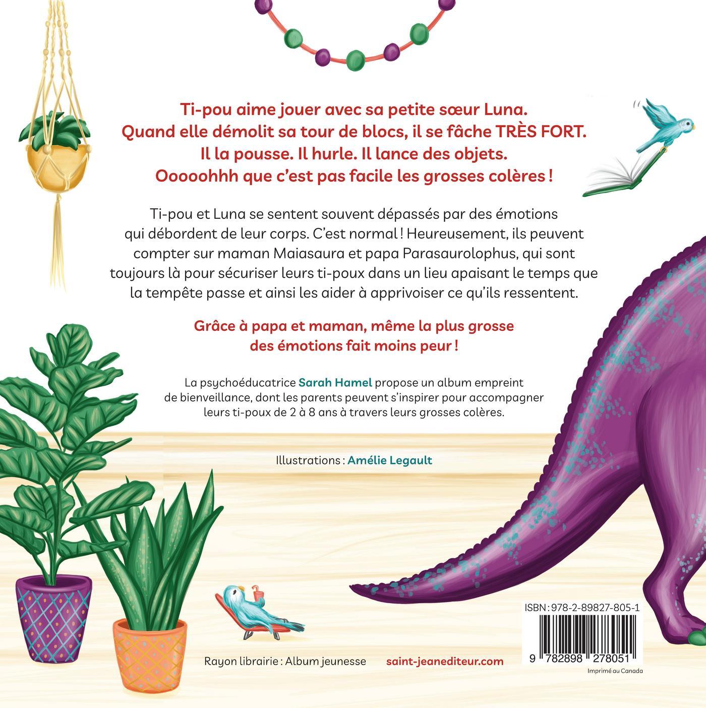 Ti-pou aime jouer avec sa petite sœur Luna.Quand elle démolit sa tour de blocs, il se fâche TRÈS FORT.Il la pousse. Il hurle. Il lance des objets. Ooooohhh que c’est pas facile les grosses colères !Ti-pou et Luna se sentent souvent dépassés par des émotions qui débordent de leur corps. C’est normal ! Heureusement, ils peuvent compter sur maman Maiasaura et papa Parasaurolophus, qui sont toujours là pour sécuriser leurs ti-poux dans un lieu apaisant le temps que la tempête passe et ainsi les aider à apprivoiser ce qu’ils ressentent. Grâce à papa et maman, même la plus grosse des émotions fait moins peur !La psychoéducatrice Sarah Hamel propose un album empreint de bienveillance, dont les parents peuvent s’inspirer pour accompagner leurs ti-poux de 2 à 8 ans à travers leurs grosses colères.