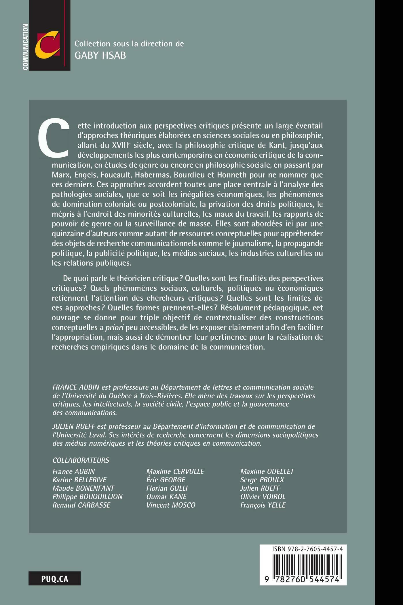 Cette introduction aux perspectives critiques présente un large éventail d’approches théoriques élaborées en sciences sociales ou en philosophie, allant du XVIIIe siècle, avec la philosophie critique de Kant, jusqu’aux développements les plus contemporains en économie critique de la communication, en études de genre ou encore en philosophie sociale, en passant par Marx, Engels, Foucault, Habermas, Bourdieu et Honneth pour ne nommer que ces derniers. Ces approches accordent toutes une place centrale à l’analyse des pathologies sociales, que ce soit les inégalités économiques, les phénomènes de domination coloniale ou postcoloniale, la privation des droits politiques, le mépris à l’endroit des minorités culturelles, les maux du travail, les rapports de pouvoir de genre ou la surveillance de masse. Elles sont abordées ici par une quinzaine d’auteurs comme autant de ressources conceptuelles pour appréhender des objets de recherche communicationnels comme le journalisme, la propagande politique, la publicité politique, les médias sociaux, les industries culturelles ou les relations publiques.De quoi parle le théoricien critique ? Quelles sont les finalités des perspectives critiques ? Quels phénomènes sociaux, culturels, politiques ou économiques retiennent l’attention des chercheurs critiques ? Quelles sont les limites de ces approches ? Quelles formes prennent-elles ? Résolument pédagogique, cet ouvrage se donne pour triple objectif de contextualiser des constructions conceptuelles a priori peu accessibles, de les exposer clairement afin d’en faciliter l’appropriation, mais aussi de démontrer leur pertinence pour la réalisation de recherches empiriques dans le domaine de la communication.