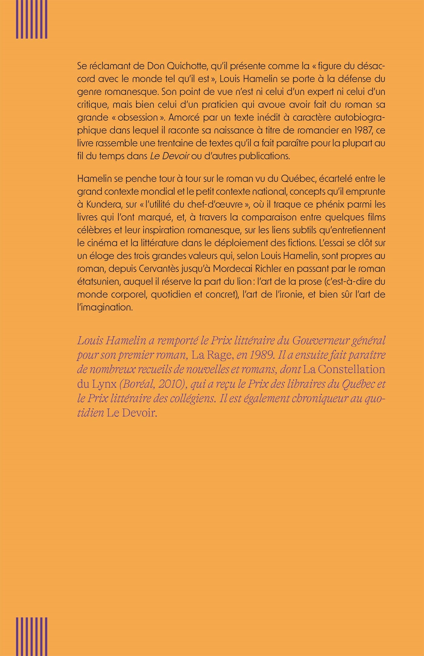 En 2012 et 2013, Louis Hamelin avait publié dans le magazine Spirale une série de réflexions sur l’art du roman sous le titre « Les héritiers de Don Quichotte ». Une décennie plus tard, il se porte à nouveau à la défense du genre romanesque en mettant bout à bout une trentaine d’articles ou de chroniques qu’il a fait paraître au fil du temps dans Le Devoir et dans d’autres publications.
