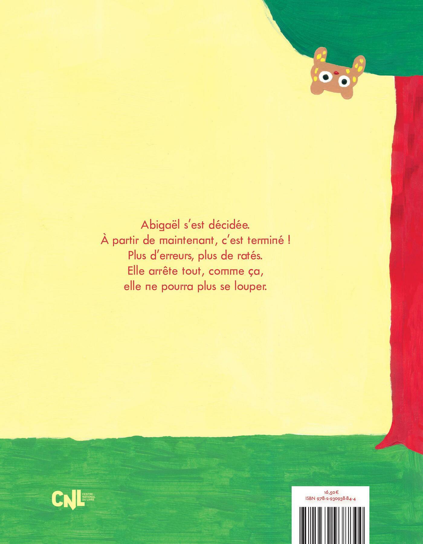 Abigaël en a assez. Chaque fois qu’elle essaie de faire quelque chose, ça finit en catastrophe. Alors cette fois, c’est décidé : elle ne fera plus rien ! Comme ça, impossible de se louper. Malheureusement, la voilà obligée de partir en classe verte. Lors d’un jeu collectif, elle est tellement stressée à l’idée d’échouer qu’elle finit par tout faire capoter. Furieuse, elle s’enfuit en courant… et se perd dans la forêt. Elle n’a pas le choix, elle va devoir se débrouiller. Va-t-elle réussir à se faire un abri pour la nuit ? À trouver un petit déjeuner ? Et à retrouver ses camarades ?Un récit d’apprentissage au ton humoristique, servi par des illustrations à la gouache dans des couleurs acidulées.