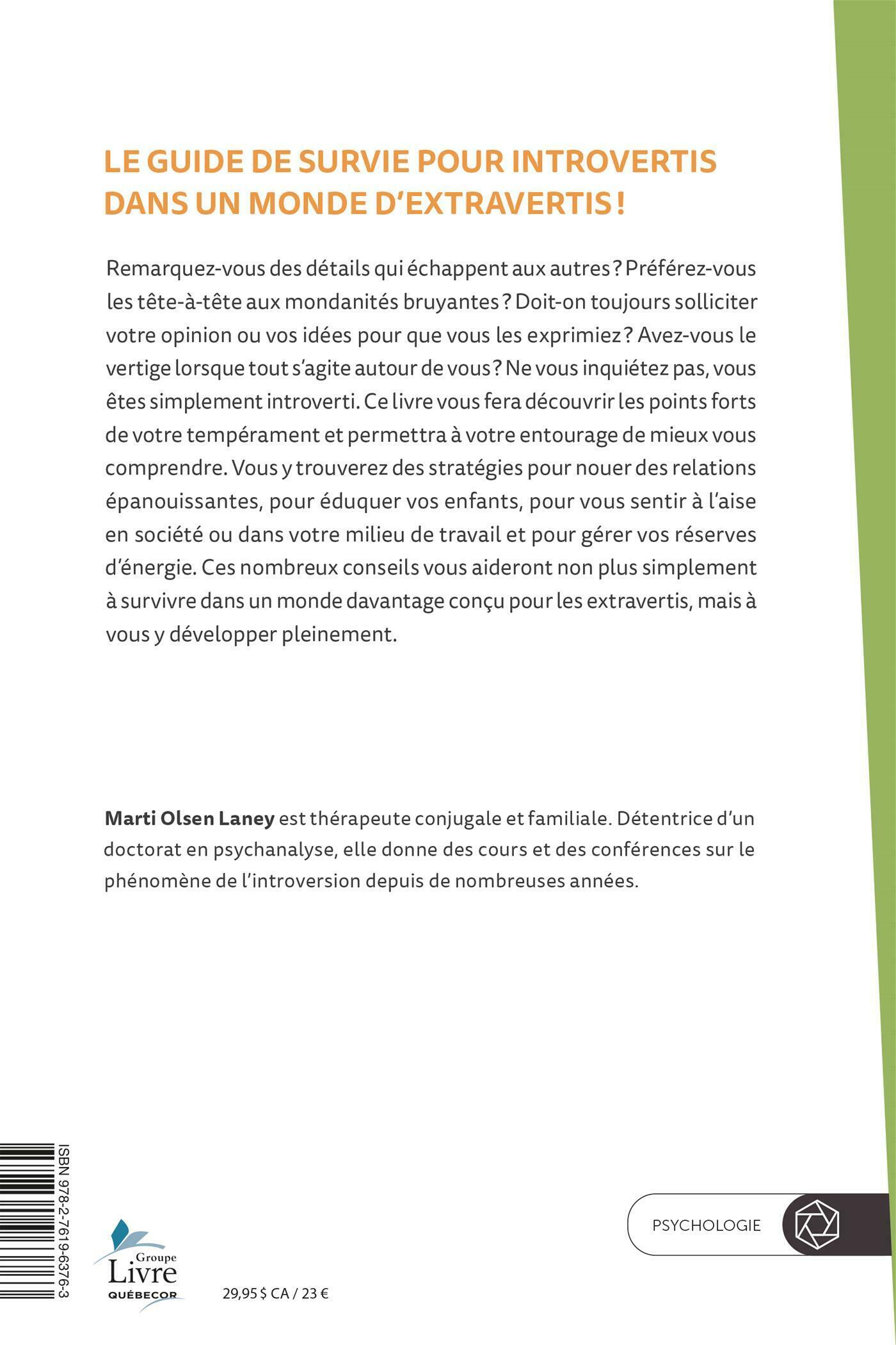 Remarquez-vous des détails qui échappent aux autres ? Préférez-vous les tête-à-tête aux mondanités bruyantes ? Doit-on toujours solliciter votre opinion ou vos idées pour que vous les exprimiez ? Avez-vous le vertige lorsque tout s'agite autour de vous ? Ne vous inquiétez pas, vous êtes simplement introverti. Ce livre vous fera découvrir les points forts de votre tempérament et permettra à votre entourage de mieux vous comprendre. Vous y trouverez des stratégies pour nouer des relations épanouissantes, pour éduquer vos enfants, pour vous sentir à l'aise en société ou dans votre milieu de travail et pour gérer vos réserves d'énergie. Ces nombreux conseils vous aideront non plus simplement à survivre dans un monde davantage conçu pour les extravertis, mais à vous y développer pleinement.