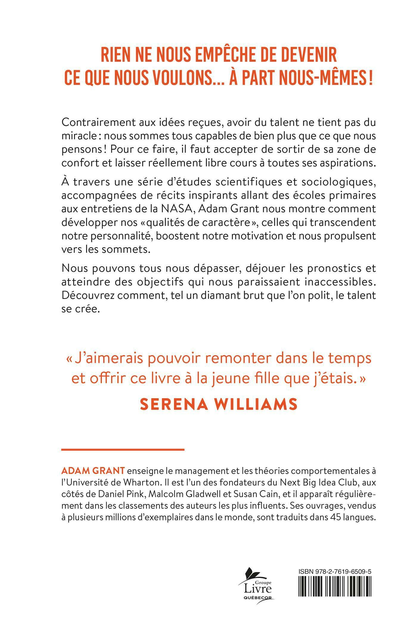 Contrairement aux idées reçues, avoir du talent ne tient pas du miracle : nous sommes tous capables de bien plus que ce que nous pensons ! Pour ce faire, il faut accepter de sortir de sa zone de confort et laisser réellement libre cours à toutes ses aspirations. À travers une série d'études scientifiques et sociologiques, accompagnées de récits inspirants allant des écoles primaires aux entretiens de la NASA, Adam Grant nous montre comment développer nos
