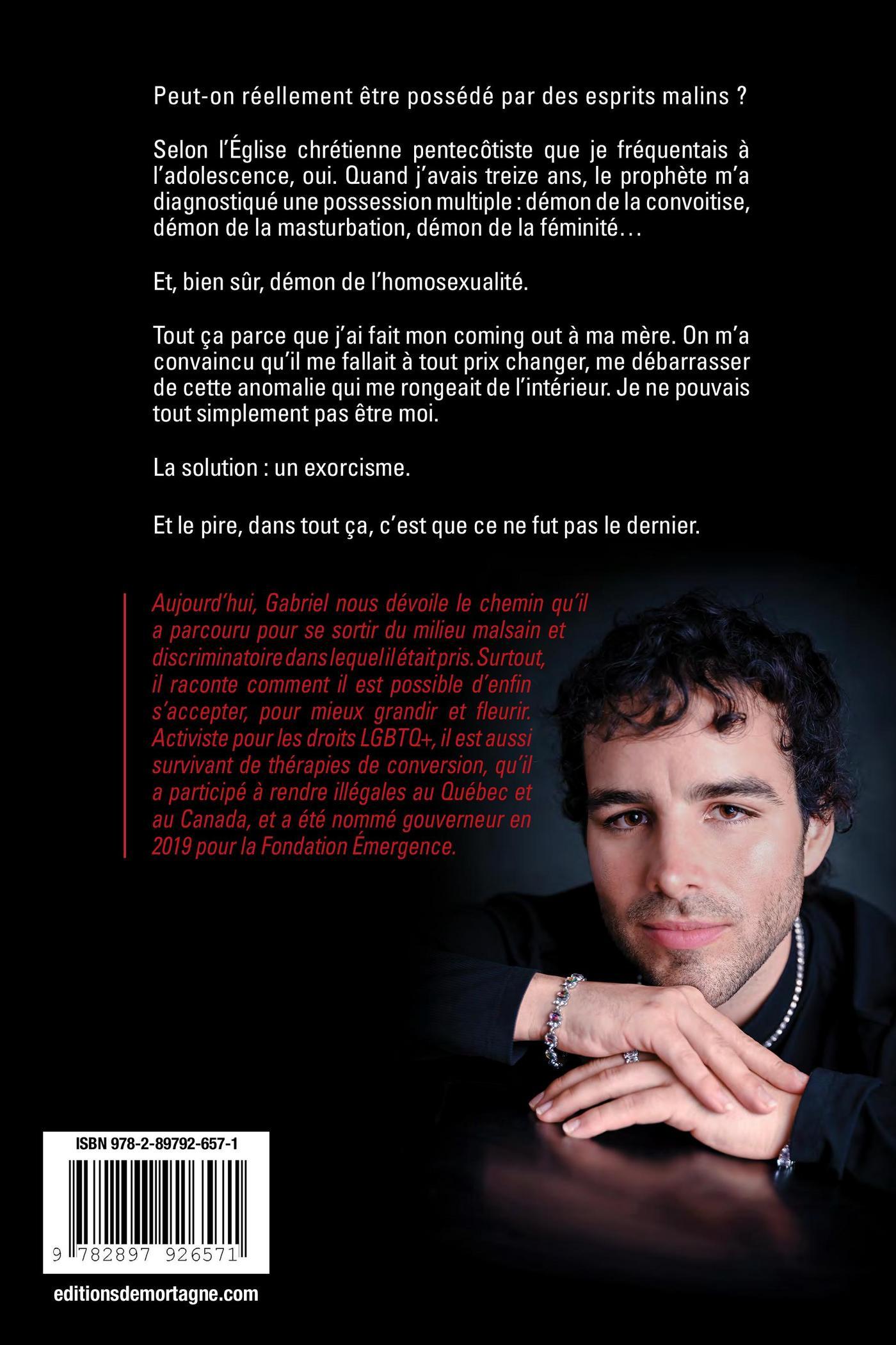 Peut-on réellement être possédé par des esprits malins ?Selon l’Église chrétienne pentecôtiste que je fréquentais à l’adolescence, oui. Quand j’avais treize ans, le prophète m’a diagnostiqué une possession multiple : démon de la convoitise, démon de la masturbation, démon de la féminité…Et, bien sûr, démon de l’homosexualité.Tout ça parce que j’ai fait mon coming out à ma mère. On m’a convaincu qu’il me fallait à tout prix changer, me débarrasser de cette anomalie qui me rongeait de l’intérieur. Je ne pouvais tout simplement pas être moi.La solution : un exorcisme.Et le pire, dans tout ça, c’est que ce ne fut pas le dernier.Aujourd’hui, Gabriel nous dévoile le chemin qu’il a parcouru pour se sortir du milieu malsain et discriminatoire dans lequel il était pris. Surtout, il raconte comment il est possible d’enfin s’accepter, pour mieux grandir et fleurir. Activiste pour les droits LGBTQ+, il est aussi survivant de thérapies de conversion, qu’il a participé à rendre illégales au Québec et au Canada, et a été nommé gouverneur en 2019 pour la Fondation Émergence.