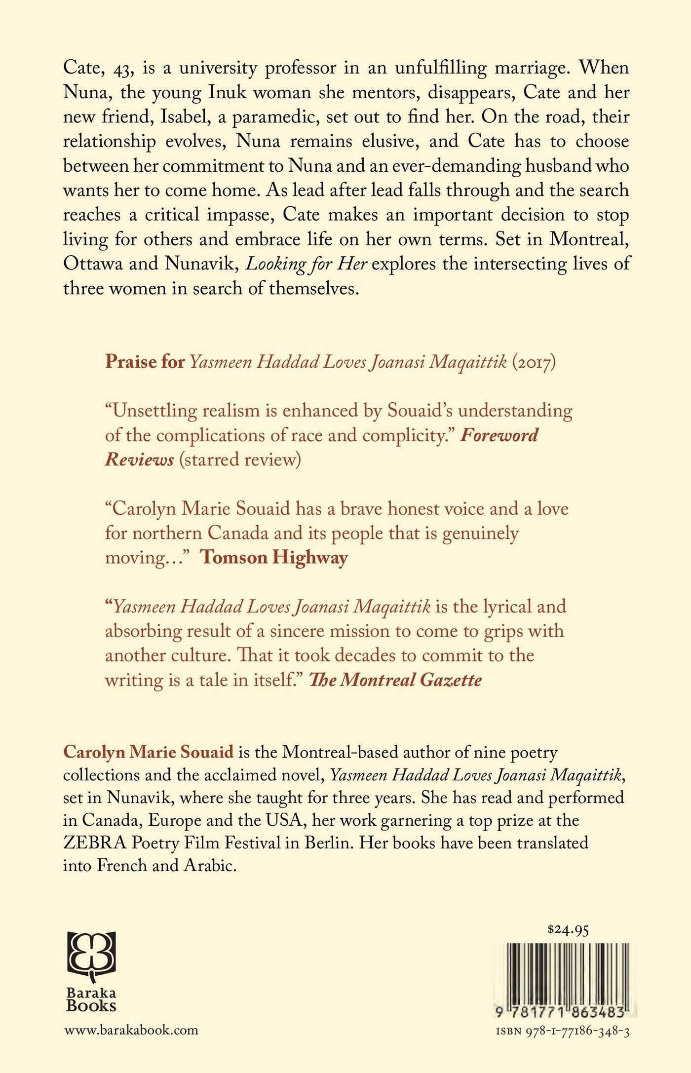 Cate, 43, is a university professor in an unfulfilling marriage. When Nuna, the young Inuk woman she mentors, disappears, Cate and her new friend, Isabel, 28, set out on a journey to find her. On the road, their friendship is tested, Nuna remains elusive, and Cate must contend with her ever-demanding husband who wants her to come home. As lead after lead falls through and the search reaches a critical impasse, Cate makes an important decision to stop living for others and finally live life on her own terms.Set in Montreal, Ottawa and Nunavik, Looking for Her explores the intersecting lives of three women in search of themselves.Carolyn Marie Souaid is the Montreal-based author of nine poetry collections and the acclaimed novel, Yasmeen Haddad Loves Joanasi Maqaittik, set in Nunavik (Northern Canada), where she lived and worked for three years in the 1980s. She has performed at literary events in Canada and abroad, her work garnering a top prize at the 2012 Berlin Zebra Poetry Film Festival. Her literary papers (1967-2022) are housed in the Rare Books and Special Collections of McGill University’s McLennan Library.About Carolyn Marie Souaid’s previous workFor Yasmeen Haddad Loves Joanasi Maqaittik“Her language naturally pairs with the physicality of the story … Unsettling realism is enhanced by Souaid’s understanding of the complications of race and complicity.” Starred Review, Foreword Reviews“Carolyn Marie Souaid has a brave honest voice and a love for northern Canada and its people that is genuinely moving to read about.” Tomson Highway“Yasmeen Haddad Loves Joanasi Maqaittik is the lyrical and absorbing result of a sincere mission to come to grips with another culture. That it took decades to commit to the writing is a tale in itself.” Ian McGillis, The Montreal GazetteFor This Side of Light (2022) (Poetry)“This carefully edited book lives up to the task of bringing together Souaid’s powerful poems into a selected volume…a significant contribution to Canadian literature.” Jury Citation, Shortlisted for the Mary Scorer Award for Best Book by a Manitoba Publisher“Souaid’s fearlessness is unapologetic, and offers a courageous worldview, one that doesn’t hide from the truth.” Montreal Review of BooksFor The Eleventh Hour (2020)“The Eleventh Hour is deliciously paced and gorgeous. It makes the reader want to slow down and speed up at the same time – to revel in the words and rhythms but also to give in to the narrative thrust of each poem’s twists and turns and surprises.” The Pacific Rim Review of BooksFor This World We Invented (2015)“Souaid has her fingers so delicately placed on the pulse of her audience that they hardly notice when she starts to pinch…Not many books of poetry dance like this. Sublime and superb. I would like to use every compliment I can think of. Brilliant.” Michael Dennis, Today’s Book of Poetry, 2015For Satie’s Sad Piano (2004)“This long poem is perhaps the first serious effort to encompass the nation since Dennis Lee’s problematically Ontario centric/Torontonian Civil Elegies appeared in 1968 and 1972.” George Elliott Clarke, The Halifax Herald