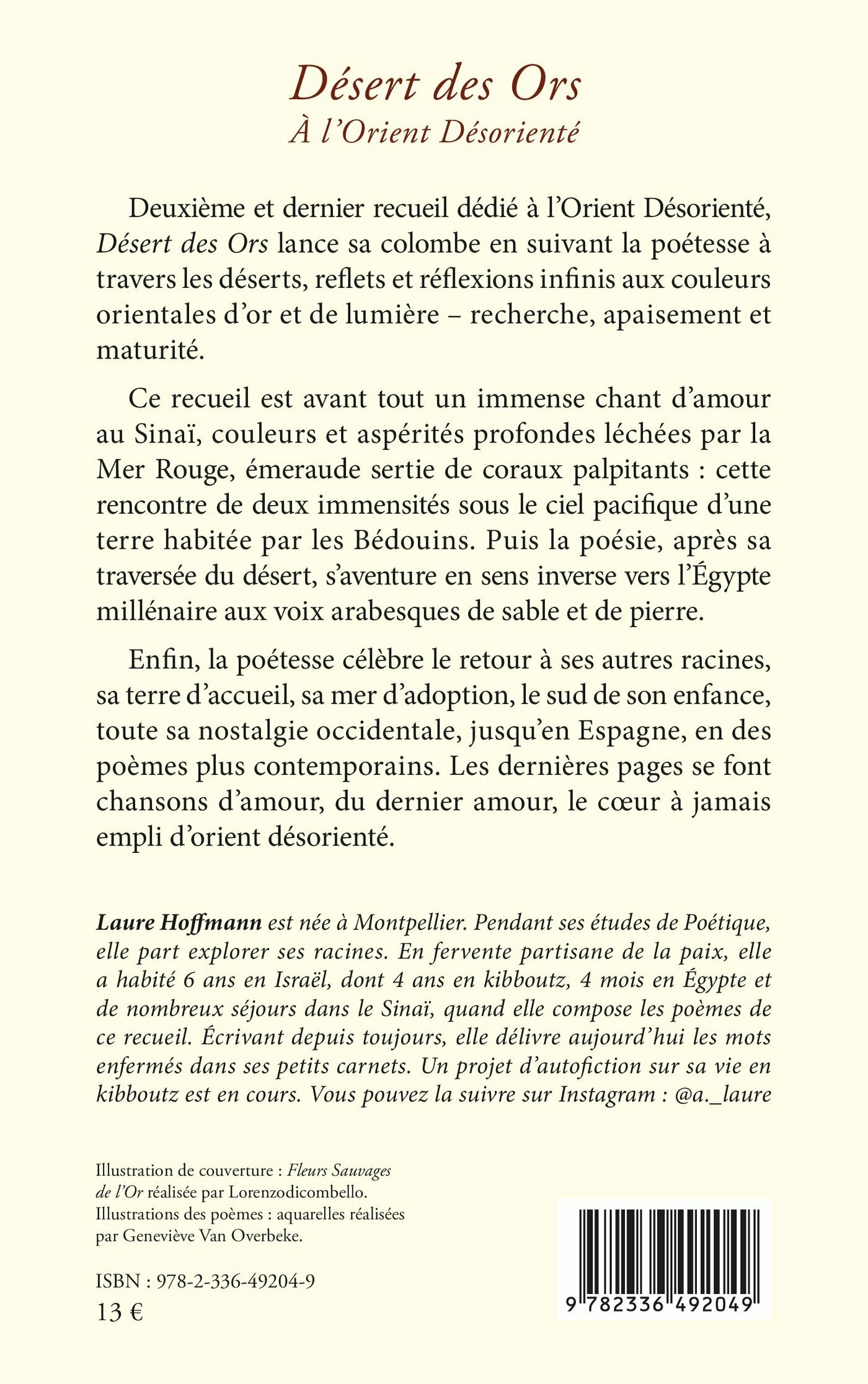 Deuxième et dernier recueil dédié à l’Orient Désorienté, Déserts des Ors lance sa colombe en suivant la poétesse à travers les déserts, reflets et réflexions infinis aux couleurs orientales d’or et de lumière – recherche, apaisement et maturité.