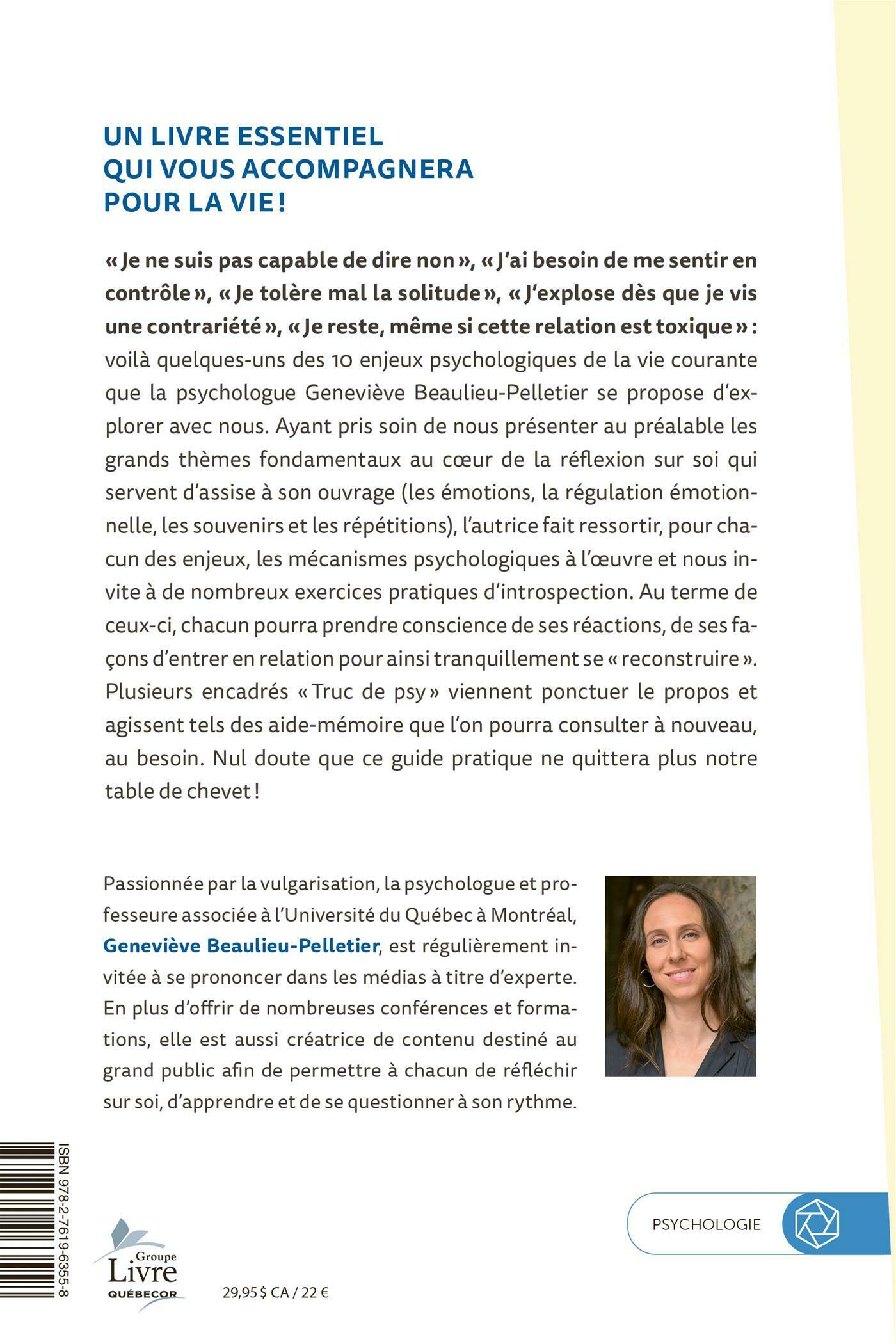 «Je ne suis pas capable de dire non», «J'ai besoin de me sentir en contrôle », «Je tolère mal la solitude», «J'explose dès que je vis une contrariété», «Je reste, même si cette relation est toxique»: voilà quelques-uns des 10 enjeux psychologiques de la vie courante que la psychologue Geneviève Beaulieu-Pelletier se propose d'explorer avec nous.