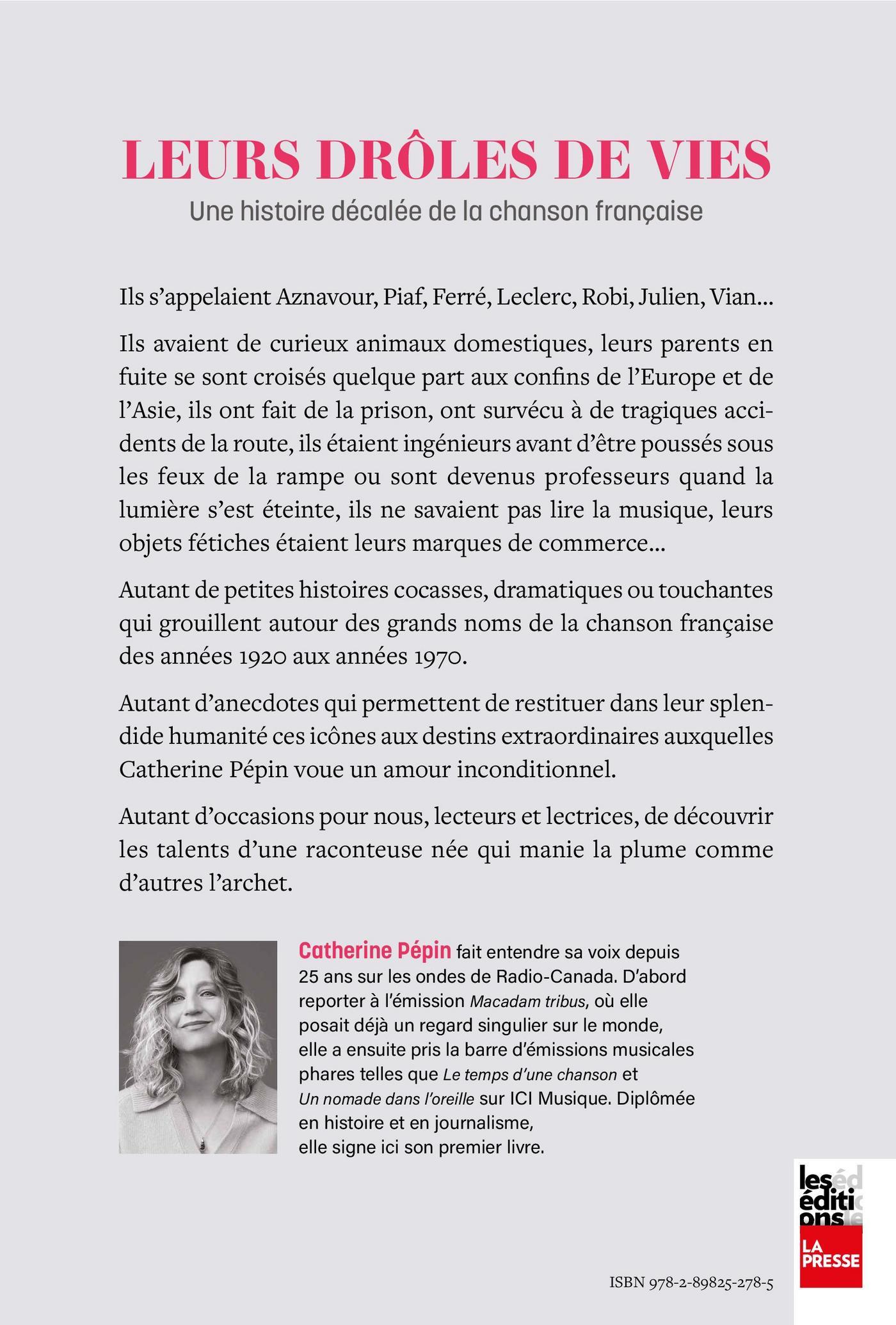 Ils s’appelaient Aznavour, Piaf, Ferré, Leclerc, Robi, Julien, Vian…Ils avaient de curieux animaux domestiques, leurs parents en fuite se sont croisés quelque part aux confins de l’Europe et de l’Asie, ils ont fait de la prison, ont survécu à de tragiques accidents de la route, ils étaient ingénieurs avant d’être poussés sous les feux de la rampe ou sont devenus professeurs quand la lumière s’est éteinte, ils ne savaient pas lire la musique, leurs objets fétiches étaient leurs marques de commerce…Autant de petites histoires cocasses, dramatiques ou touchantes qui grouillent autour des grands noms de la chanson française des années 1920 aux années 1970.Autant d’anecdotes qui permettent de restituer dans leur splendide humanité ces icônes aux destins extraordinaires auxquelles Catherine Pépin voue un amour inconditionnel.Autant d’occasions pour nous, lecteurs et lectrices, de découvrir les talents d’une raconteuse née qui manie la plume comme d’autres l’archet.