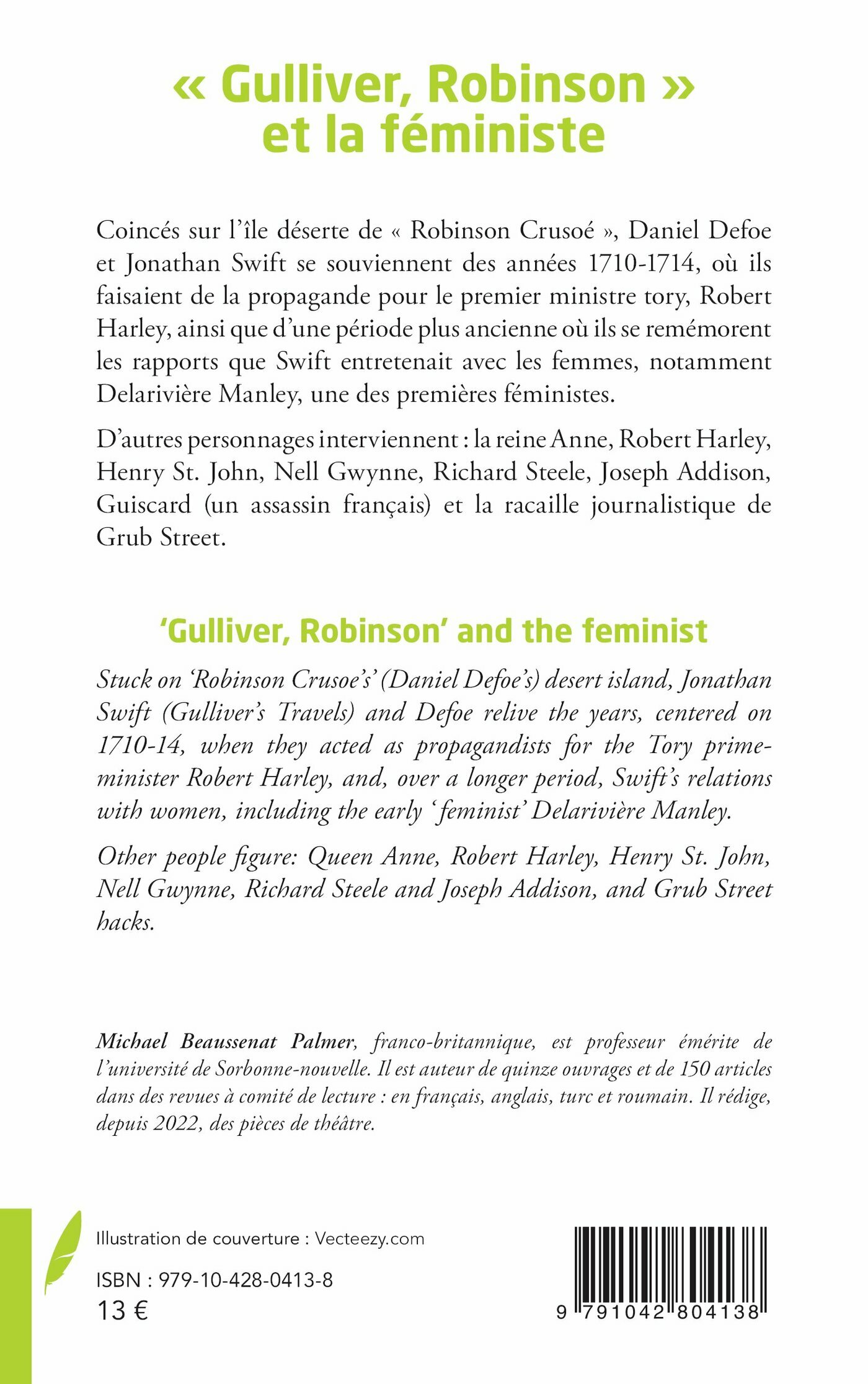 Coincés sur l’île déserte de « Robinson Crusoé », Daniel Defoe et Jonathan Swift se souviennent des années 1710-1714, où ils faisaient de la propagande pour le premier ministre tory, Robert Harley, ainsi que d’une période plus ancienne où ils se remémorent les rapports que Swift entretenait avec les femmes, notamment Delarivière Manley, une des premières féministes.