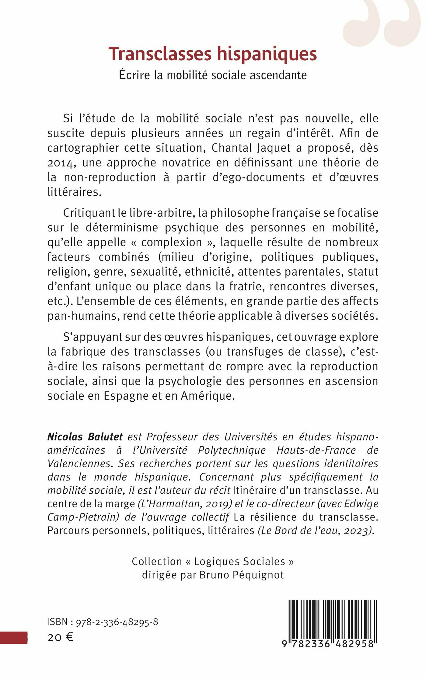 S’appuyant sur des œuvres hispaniques, le présent ouvrage explore la fabrique des transclasses (ou transfuges de classe), c’est-à-dire les raisons permettant de rompre avec la reproduction sociale, et la psychologie des personnes en ascension sociale en Espagne et en Amérique.