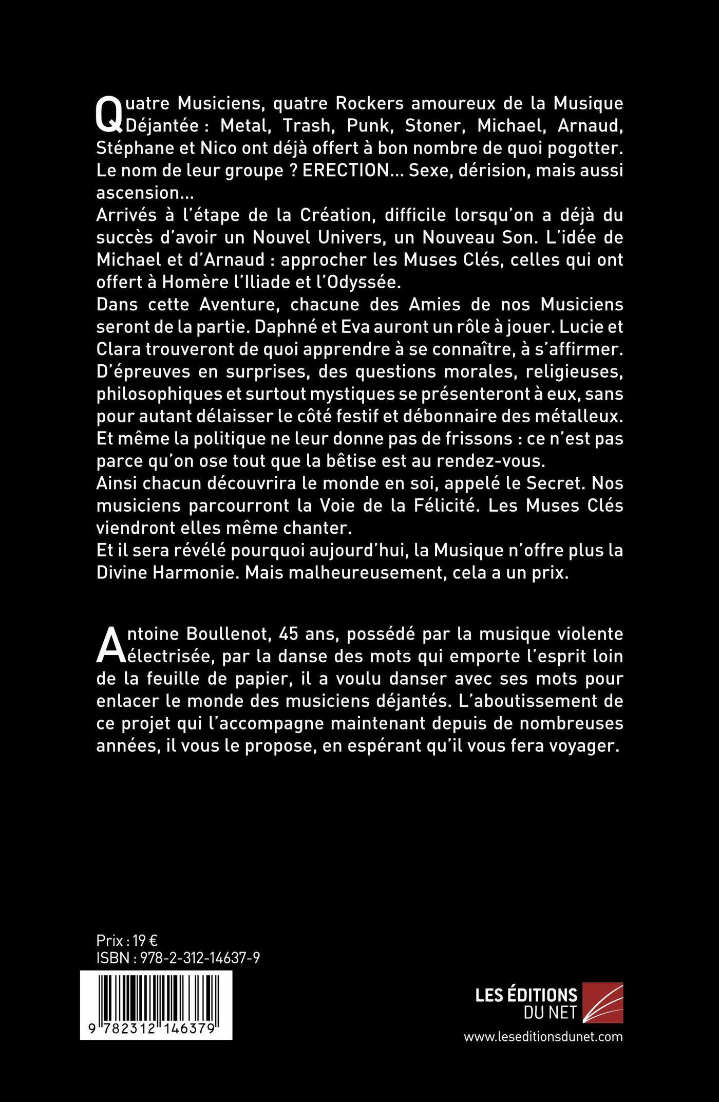 Quatre Musiciens, quatre Rockers amoureux de la Musique Déjantée : Metal, Trash, Punk, Stoner, Michael, Arnaud, Stéphane et Nico ont déjà offert à bon nombre de quoi pogotter. Le nom de leur groupe ? ERECTION… Sexe, dérision, mais aussi ascension…Arrivés à l’étape de la Création, difficile lorsqu’on a déjà du succès d’avoir un Nouvel Univers, un Nouveau Son. L’idée de Michael et d’Arnaud : approcher les Muses Clés, celles qui ont offert à Homère l’Iliade et l’Odyssée.Dans cette Aventure, chacune des Amies de nos Musiciens seront de la partie. Daphné et Eva auront un rôle à jouer. Lucie et Clara trouveront de quoi apprendre à se connaître, à s’affirmer.D’épreuves en surprises, des questions morales, religieuses, philosophiques et surtout mystiques se présenteront à eux, sans pour autant délaisser le côté festif et débonnaire des métalleux.Et même la politique ne leur donne pas de frissons : ce n’est pas parce qu’on ose tout que la bêtise est au rendez-vous.Ainsi chacun découvrira le monde en soi, appelé le Secret. Nos musiciens parcourront la Voie de la Félicité. Les Muses Clés viendront elles même chanter.Et il sera révélé pourquoi aujourd’hui, la Musique n’offre plus la Divine Harmonie. Mais malheureusement, cela a un prix.