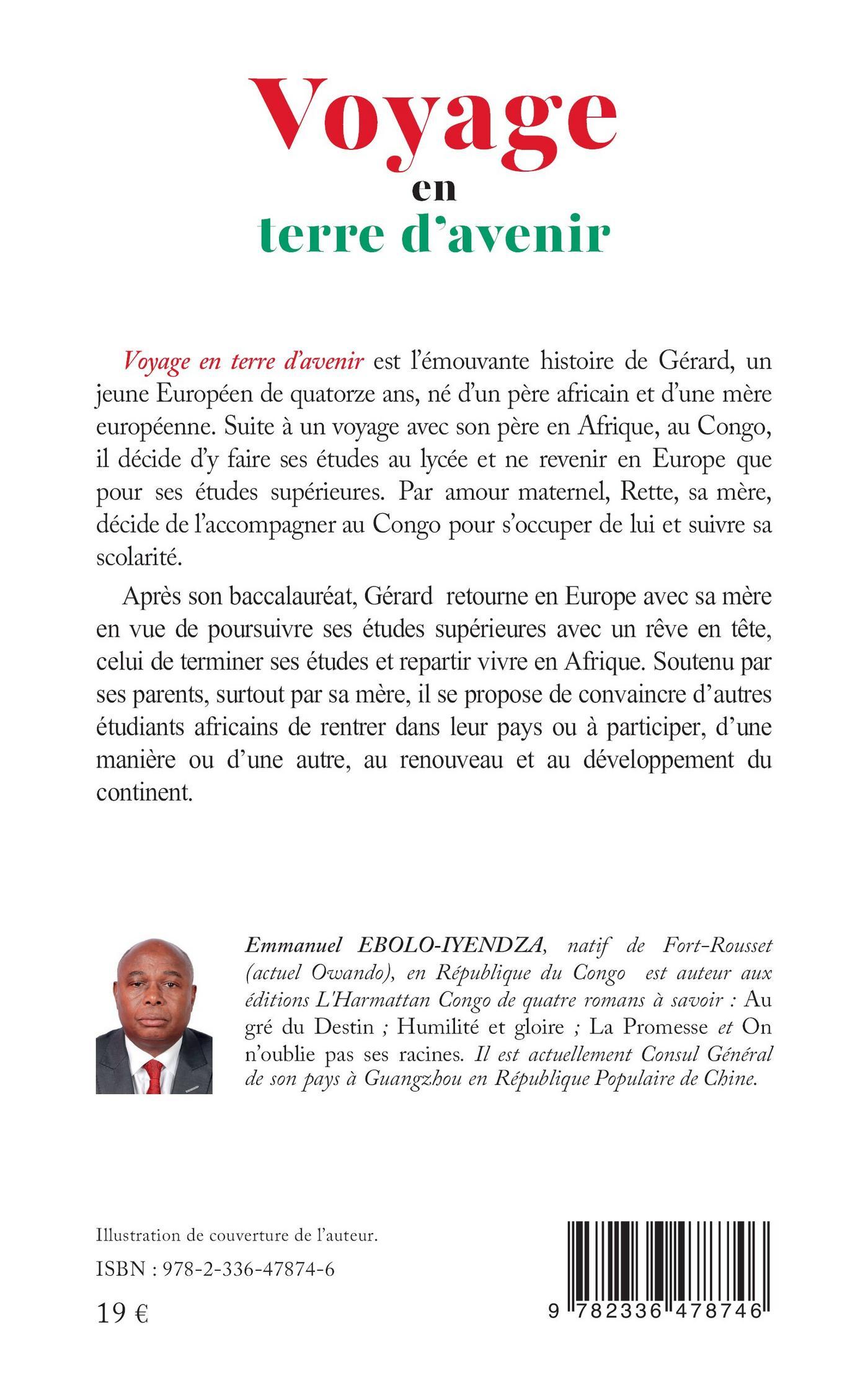 Voyage en terre d’avenir est l'émouvante histoire de Gérard, un jeune Européen de quatorze ans, né d’un père africain et d’une mère européenne. Suite à un voyage avec son père en Afrique, au Congo, il décide d'y faire ses études au lycée et ne revenir en Europe que pour ses études supérieures. Par amour maternel, Pierrette, sa mère, décide de l'accompagner au Congo pour s’occuper de lui et suivre sa scolarité.