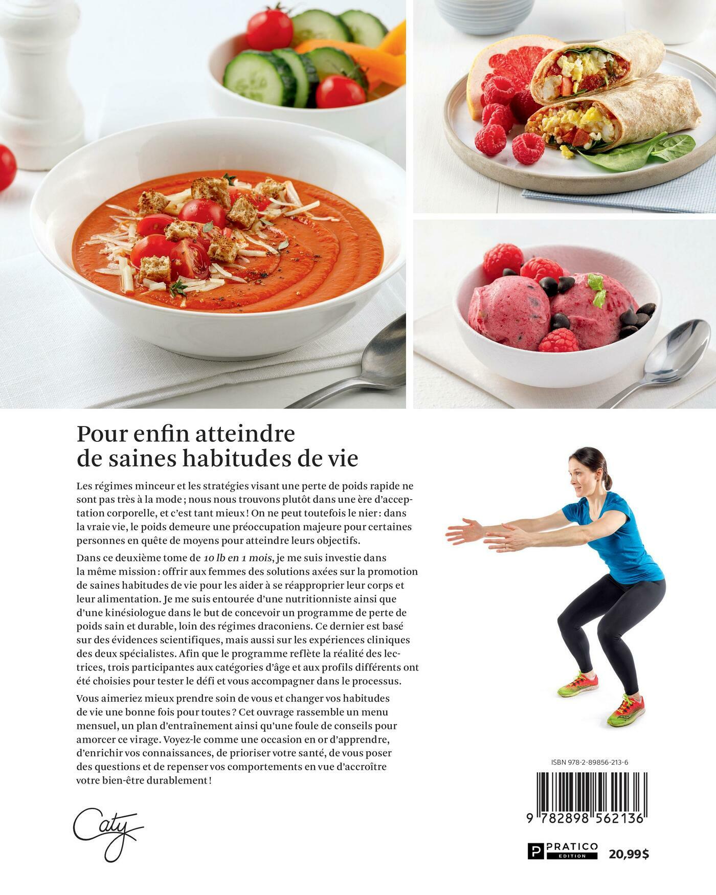 Les régimes minceur et les stratégies visant une perte de poids rapide ne sont pas très à la mode ; nous nous trouvons plutôt dans une ère d’acceptation corporelle, et c’est tant mieux ! On ne peut toutefois le nier : dans la vraie vie, le poids demeure une préoccupation majeure pour certaines personnes en quête de moyens pour atteindre leurs objectifs. Dans ce deuxième tome de 10 lb en 1 mois, je me suis investie dans la même mission : offrir aux femmes des solutions axées sur la promotion de saines habitudes de vie pour les aider à se réapproprier leur corps et leur alimentation. Je me suis entourée d’une nutritionniste ainsi que d’une kinésiologue dans le but de concevoir un programme de perte de poids sain et durable, loin des régimes draconiens. Ce dernier est basé sur des évidences scientifiques, mais aussi sur les expériences cliniques des deux spécialistes. Afin que le programme reflète la réalité des lectrices, trois participantes aux catégories d’âge et aux profils différents ont été choisies pour tester le défi et vous accompagner dans le processus. Vous aimeriez mieux prendre soin de vous et changer vos habitudes de vie une bonne fois pour toutes ? Cet ouvrage rassemble un menu mensuel, un plan d’entraînement ainsi qu’une foule de conseils pour amorcer ce virage. Voyez-le comme une occasion en or d’apprendre, d’enrichir vos connaissances, de prioriser votre santé, de vous poser des questions et de repenser vos comportements en vue d’accroître votre bien-être durablement !
