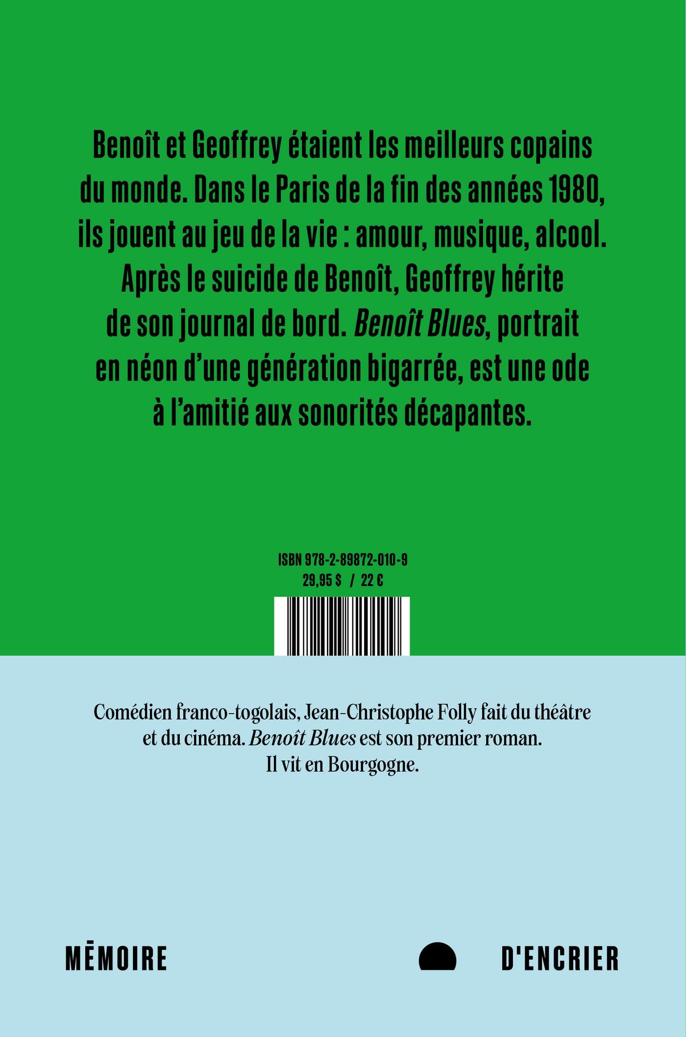 Benoît Blues, c'est l'histoire de deux amis, un Noir et un Blanc, qui étaient les meilleurs copains du monde. Nous sommes dans la scène hétéroclite du Paris des années 1980. Les amis deviennent des adultes, ils entament des carrières, font des enfants, vivent une vie de bobo, font la fête alors que les lignes de division et tensions sociales s'immiscent dans le cocon qu'ils avaient créé autour d'eux. Après le suicide de Benoît, son meilleur ami Geoffrey hérite de son journal de bord. On entend alors la voix de Benoît qui bouleverse tout ce que Geoffrey croyait savoir de leur amitié, leur identité, leur jeunesse. À travers le regard de Geoffrey, Édith, la femme qu'il aime, Benoît et toute une constellation de personnages aussi désarmants qu'imparfaits, s'exprime librement cette jeunesse qu'on nommait à l'époque "black-blanc-beur". Une jeunesse qui s'inventait un destin, sur fond d'amitié, d'amour, de musique. Et surtout d'alcool.
