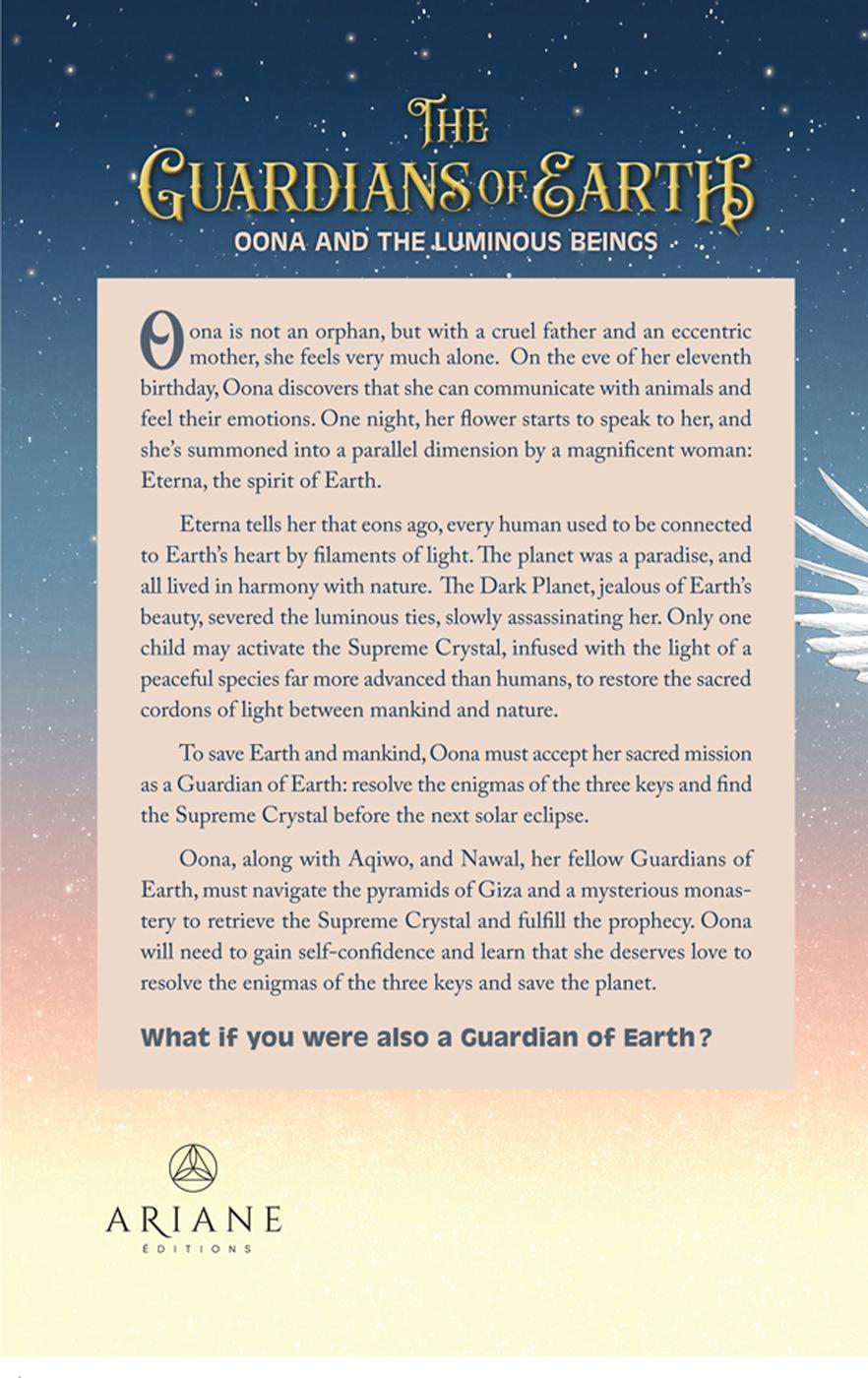 Oona is not an orphan, but with a cruel father and an eccentric mother, she feels very much alone. On the eve of her eleventh birthday, Oona discovers that she can communicate with animals and feel their emotions. One night, her flower starts to speak to her, and she’s summoned into a parallel dimension by a magnificent woman: Eterna, the spirit of Earth.Eterna tells her that eons ago, every human used to be connected to Earth’s heart by filaments of light. The planet was a paradise, and all lived in harmony with nature. The Dark Planet, jealous of Earth’s beauty, severed the luminous ties, slowly assassinating her. Only one child may activate the Supreme Crystal, infused with the light of a peaceful species far more advanced than humans, to restore the sacred cordons of light between mankind and nature.To save Earth and mankind, Oona must accept her sacred mission as a Guardian of Earth: resolve the enigmas of the three keys and find the Supreme Crystal before the next solar eclipse.Oona, along with Aqiwo, and Nawal, her fellow Guardians of Earth, must navigate the pyramids of Giza and a mysterious monasteryto retrieve the Supreme Crystal and fulfill the prophecy. Oona will need to gain self-confidence and learn that she deserves love to resolve the enigmas of the three keys and save the planet.What if you were also a Guardian of Earth ?