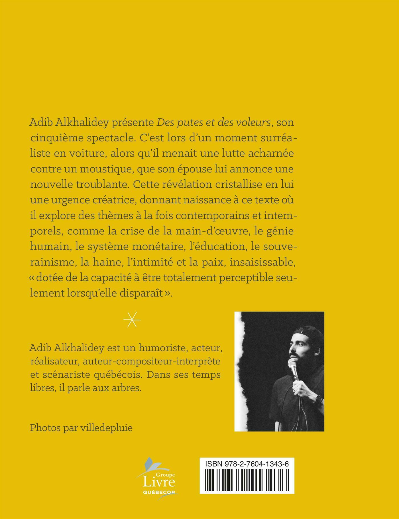 Adib Alkhalidey présente Des putes et des voleurs, son cinquième spectacle. C'est lors d'un moment surréaliste en voiture, alors qu'il menait une lutte acharnée contre un moustique, que son épouse lui annonce une nouvelle troublante. Cette révélation cristallise en lui une urgence créatrice, donnant naissance à ce texte où il explore des thèmes à la fois contemporains et intemporels, comme la crise de la main-d'oeuvre, le génie humain, le système monétaire, l'éducation, le souverainisme, la haine, l'intimité et la paix, insaisissable, « dotée de la capacité à être totalement perceptible seulement lorsqu'elle disparaît ».