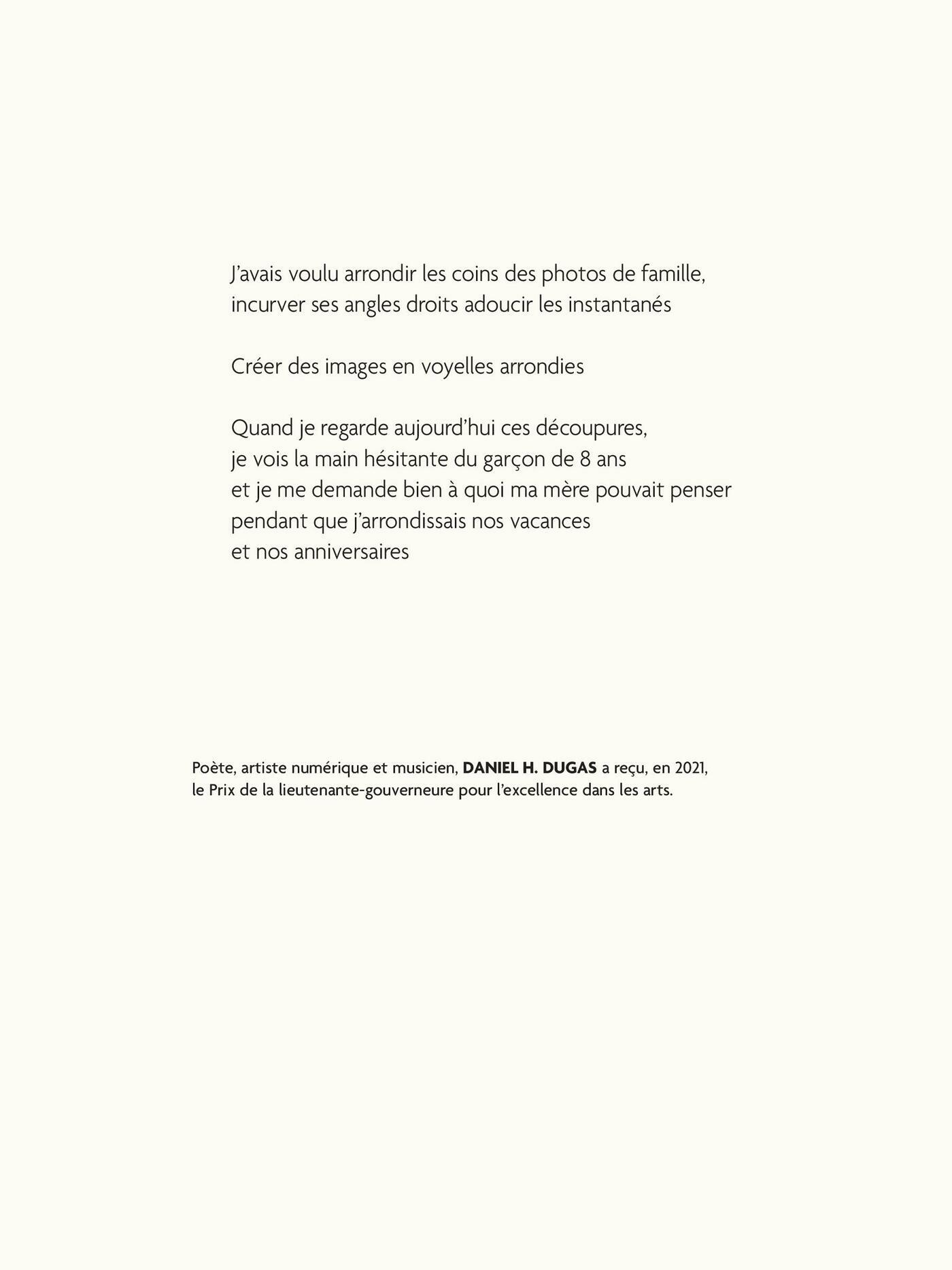 Dans «Formats», Daniel H. Dugas explore les supports qui nous ont permis, collectivement, d’emmagasiner des souvenirs et de consommer des images. Fenêtre sur le monde extérieur et son étrangeté, miroir renvoyant à soi et au familier, le format est ici une dimension, une règle, aux possibles quasi illimités. C’est aussi un terrain propice au jeu qui permet au poète de mesurer l’amplitude de l’évolution des moyens technologiques et leur impact profond sur notre rapport au réel.Tout en suivant son fil conducteur, Dugas offre également un accès à son imaginaire inusité marqué par des visites au club vidéo et les après-midis de l’enfance passés devant la télé.Dans cette œuvre qui s’inspire des formats d’écrans du cinéma et de la vidéo, la poésie rencontre l’essai pour interroger le zeitgeist d’une époque habitée par l’image et la technologie.