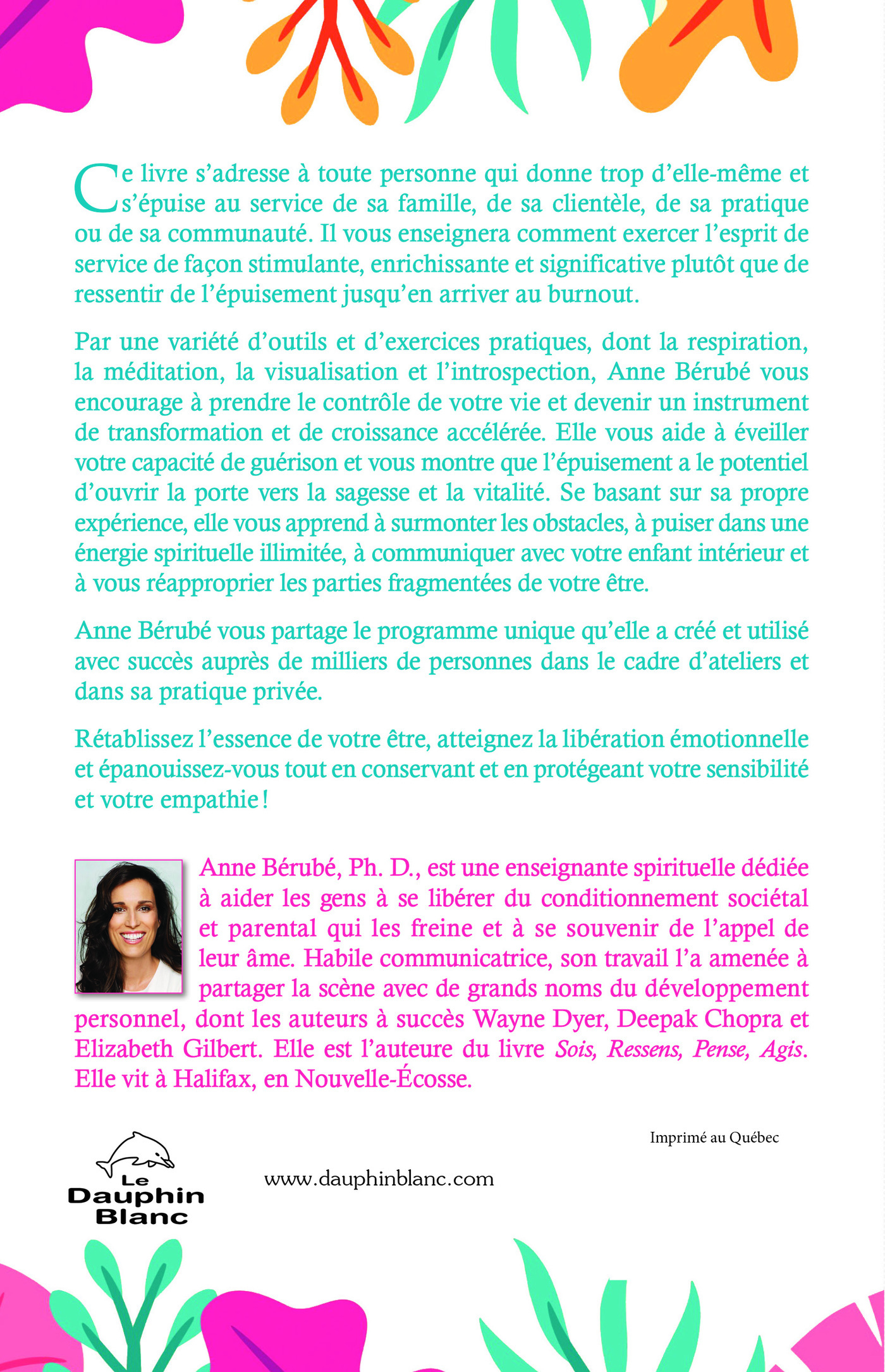 Ce livre s’adresse à toute personne qui donne trop d’elle-même et s’épuise au service de sa famille, de sa clientèle, de sa pratique ou de sa communauté. Il vous enseignera comment exercer l’esprit de service de façon stimulante, enrichissante et significative plutôt que de ressentir de l’épuisement jusqu’en arriver au burnout.Par une variété d’outils et d’exercices pratiques, dont la respiration, la méditation, la visualisation et l’introspection, Anne Bérubé vous encourage à prendre le contrôle de votre vie et devenir un instrument de transformation et de croissance accélérée. Elle vous aide à éveiller votre capacité de guérison et vous montre que l’épuisement a le potentiel d’ouvrir la porte vers la sagesse et la vitalité. Se basant sur sa propre expérience, elle vous apprend à surmonter les obstacles, à puiser dans une énergie spirituelle illimitée, à communiquer avec votre enfant intérieur et vous réapproprier les parties fragmentées de votre être.Anne Bérubé vous partage le programme unique qu’elle a créé et utilisé avec succès auprès de milliers de personnes dans le cadre d’ateliers et dans sa pratique privée.Rétablissez l’essence de votre être, atteignez la libération émotionnelle et épanouissez-vous tout en conservant et en protégeant votre sensibilité et votre empathie!L'auteure :Anne Bérubé, Ph. D., est une enseignante spirituelle dédiée à aider les gens à se libérer du conditionnement sociétal et parental qui les freine et à se souvenir de l’appel de leur âme. Habile communicatrice, son travail l’a amenée à partager la scène avec de grands noms du développement personnel, dont les auteurs à succès Wayne Dyer, Deepak Chopra et Elizabeth Gilbert. Elle est l’auteure du livre Sois, Ressens, Pense, Agis. Elle vit à Halifax, en Nouvelle-Écosse.