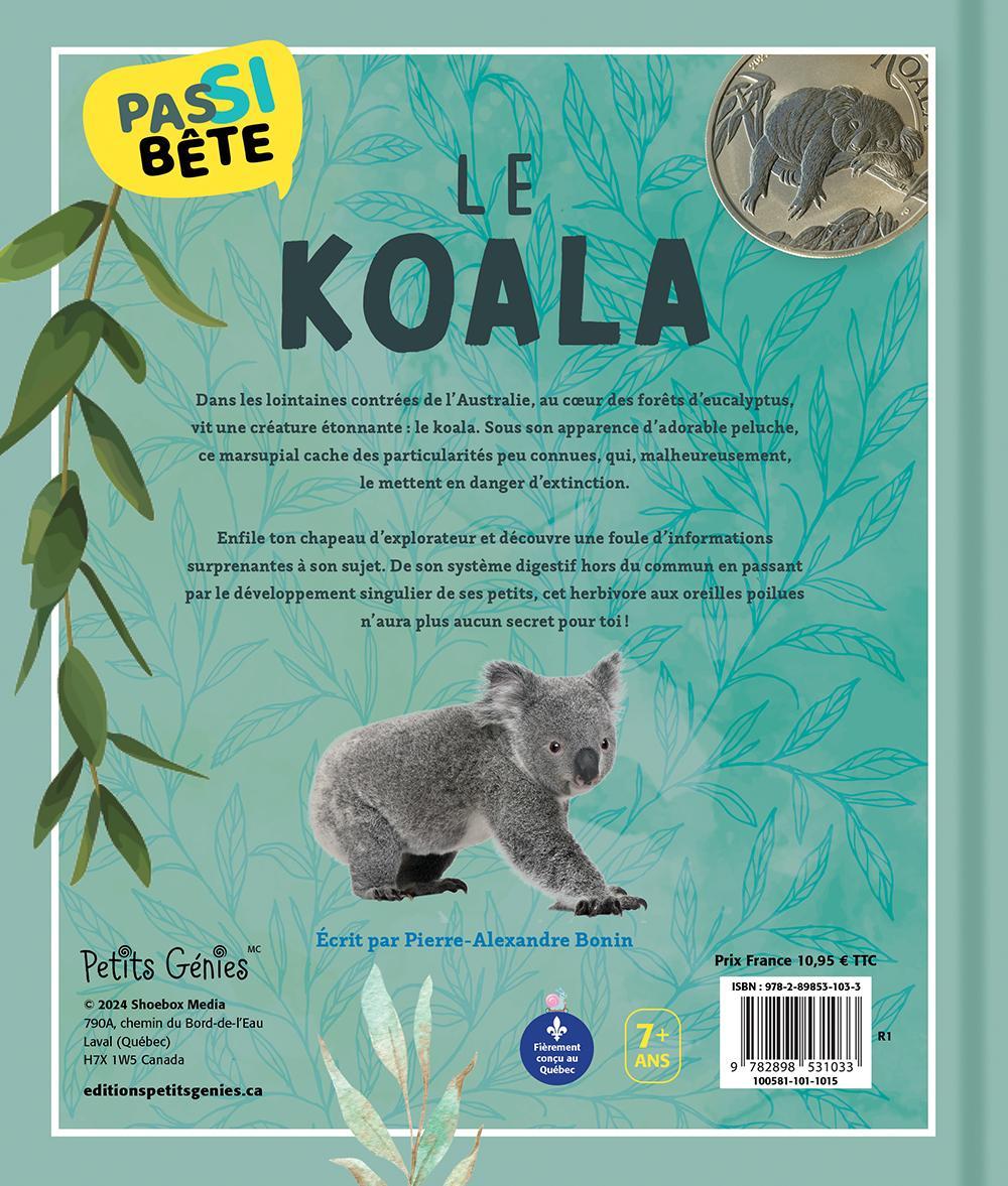 Bienvenue dans l’univers incroyable du koala!L’apparence d’adorable peluche de ce marsupial a fait du koala l’un des animaux préférés des petits et grands. Pourtant, plusieurs de ses particularités sont encore mal connues. Dans ce livre, les enfants apprendront davantage à le découvrir. Il sera question, entre autres, de :La différence entre un marsupial et un mammifère et le développement d’un bébé koalaSon mode de vie arboricoleSon régime alimentaire à base de feuilles d’eucalyptusSon système digestif absolument fascinant, ainsi que son système immunitaire faible Son statut d’espèce menacéeVous aimerez :Un livre complet sur une espèce animale qui fascine les enfants.La mise en page attrayante et dynamique qui mélange les photos et les illustrations à l’aquarelle. Le texte intéressant et bien vulgarisé, avec la touche d’humour bien connue de Pierre-Alexandre Bonin.