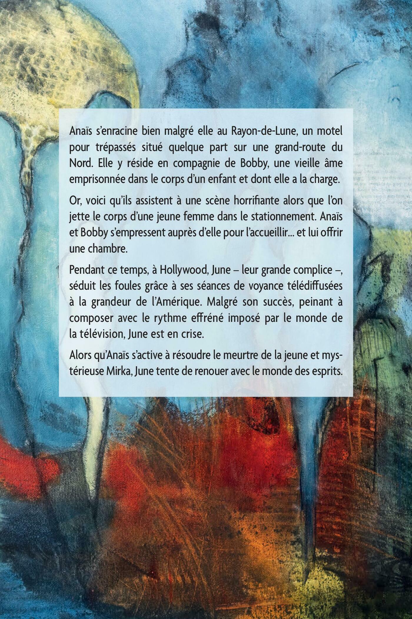 Anaïs s’enracine bien malgré elle au Rayon-de-Lune, un motel pour trépassés situé quelque part sur une grand-route du Nord. Elle y réside en compagnie de Bobby, une vieille âme emprisonnée dans le corps d’un enfant et dont elle a la charge.Or, voici qu’ils assistent à une scène horrifiante alors que l’on jette le corps d’une jeune femme dans le stationnement. Anaïs et Bobby s’empressent auprès d’elle pour l’accueillir… et lui offrir une chambre.Pendant ce temps, à Hollywood, June – leur grande complice –, séduit les foules grâce à ses séances de voyance télédiffusées à la grandeur de l’Amérique. Malgré son succès, peinant à composer avec le rythme effréné imposé par le monde de la télévision, June est en crise.Alors qu’Anaïs s’active à résoudre le meurtre de la jeune et mystérieuse Mirka, June tente de renouer avec le monde des esprits.Ce deuxième volet d’une trilogie entamée avec «Errances» marie les codes du policier et du fantastique, et poursuit l’exploration des questions existentielles qui animent les vivants… et peut-être, aussi, les morts!