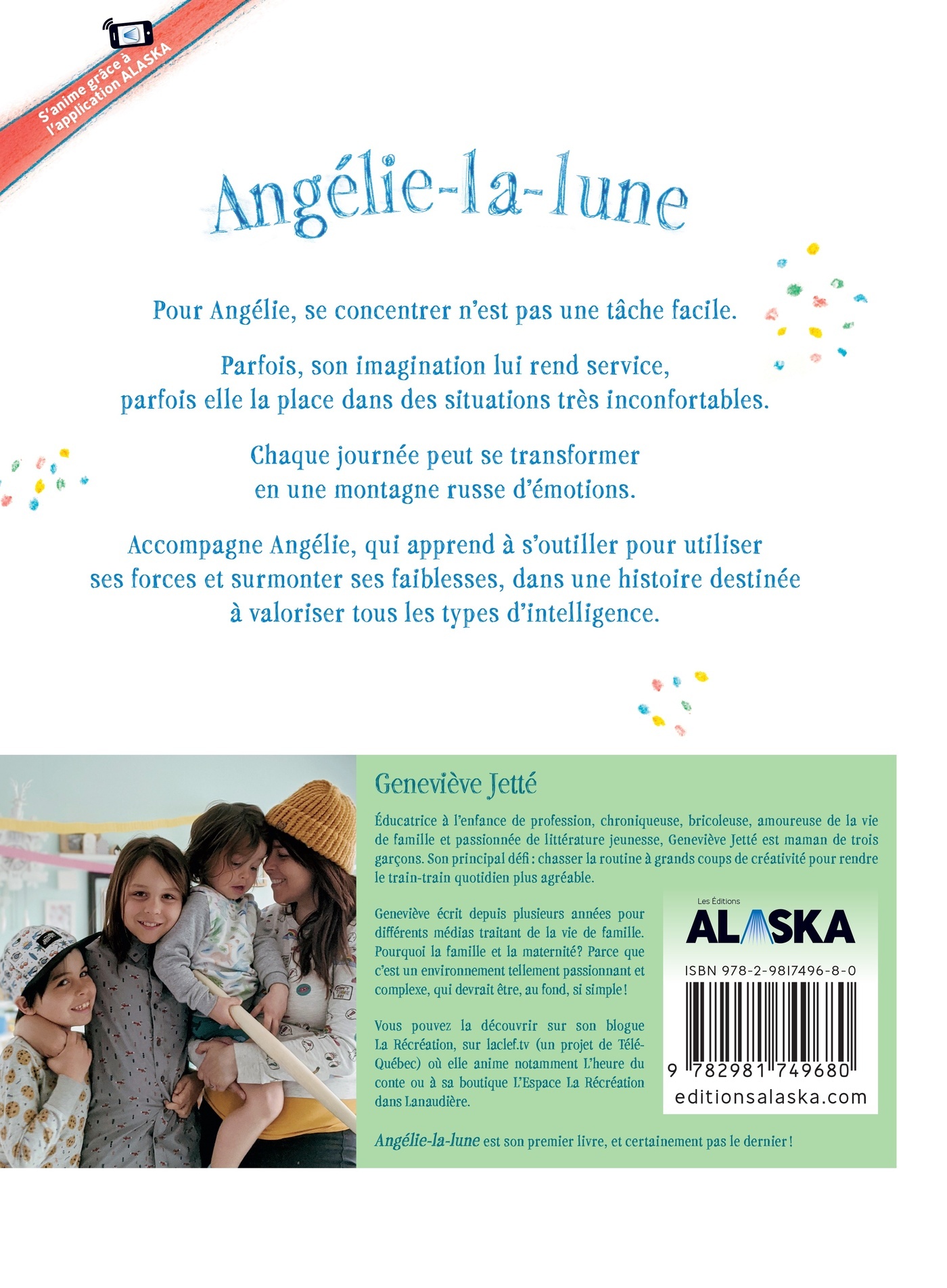 Angélie est une petite fille avec une imagination débordante. Tant et tellement que parfois ça lui joue de mauvais tour et lui vaut les moqueries de ses amis. Pour Angélie, se concentrer n’est pas une tâche facile. Parfois, son imagination lui rend service, parfois elle la place dans des situations très inconfortables. Chaque journée peut se transformer en une montagne russe d’émotions. Accompagne Angélie, qui apprend à s’outiller pour utiliser ses forces et surmonter ses faiblesses, dans une histoire destinée à valoriser tous les types d’intelligence.Ce livre est une oeuvre interactive. Il contient des illustrations qui s'animent grâce à la réalité augmentée. Téléchargez gratuitement l'application Alaska pour une expérience qui va au-delà du livre.