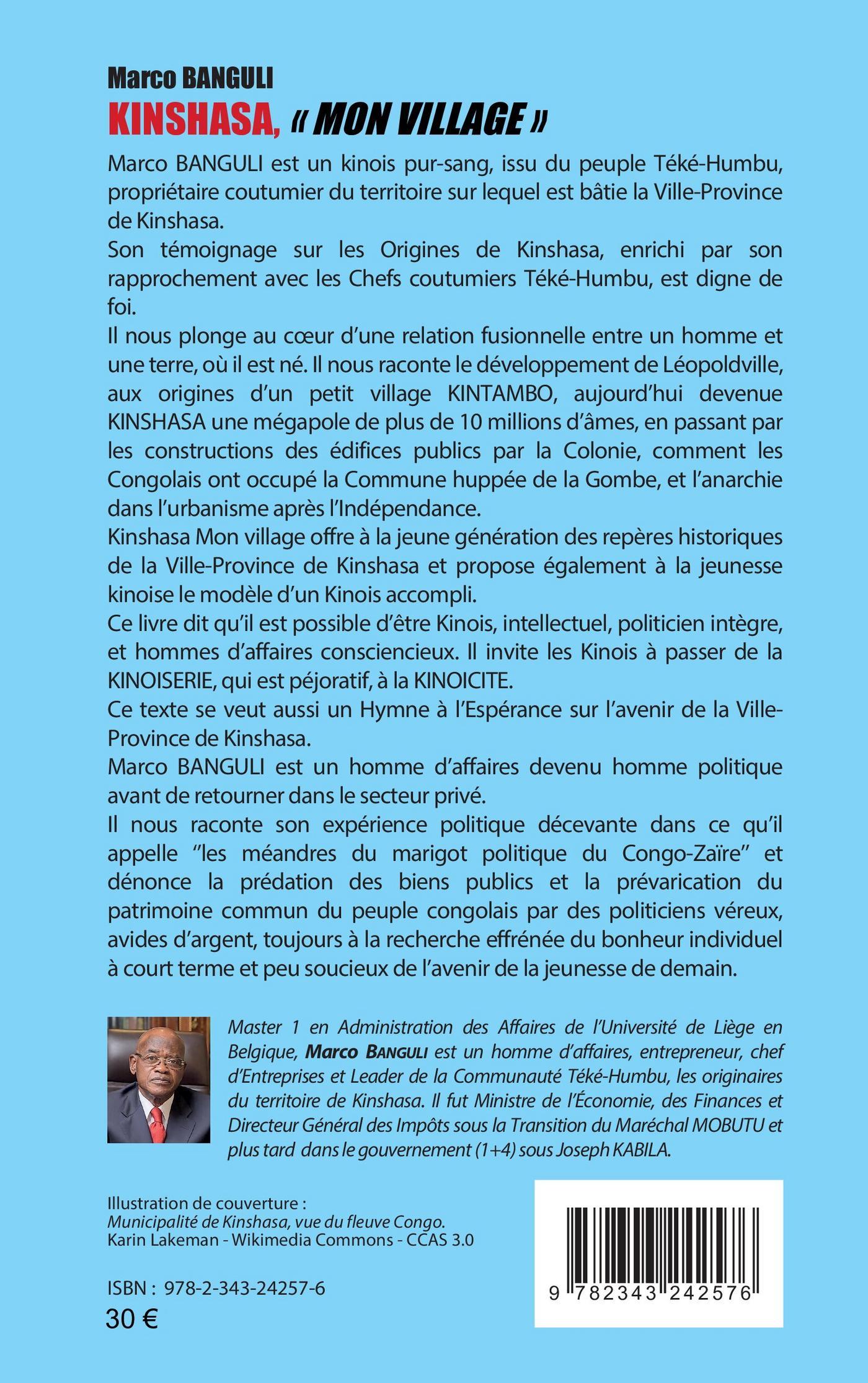 Marco BANGULI est un kinois pur-sang, issu du peuple Téké-Humbu, propriétaire coutumier du territoire sur lequel est bâtie la Ville-Province de Kinshasa. Il nous plonge au coeur d’une relation fusionnelle entre un homme et une terre, où il est né. Il nous raconte le développement de Léopoldville, aux origines d’un petit village KINTAMBO, aujourd’hui devenue KINSHASA une mégapole de plus de 10 millions d’âmes, en passant par les constructions des édifices publics par la Colonie, comment les Congolais ont occupé la Commune huppée de la Gombe, et l’anarchie dans l’urbanisme après l’Indépendance. Kinshasa Mon village offre à la jeune génération des repères historiques de la Ville-Province de Kinshasa et propose également à la jeunesse kinoise le modèle d’un Kinois accompli.