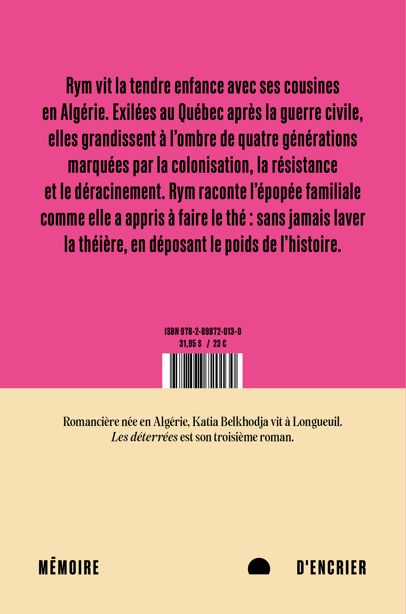 Rym vit la tendre enfance avec ses cousines en Algérie. Exilées au Québec après la guerre civile, elles grandissent à l'ombre de quatre générations marquées par la colonisation, la résistance et le déracinement. Rym raconte l'épopée familiale comme elle a appris à faire le thé : sans jamais laver la théière, en déposant le poids de l'histoire.