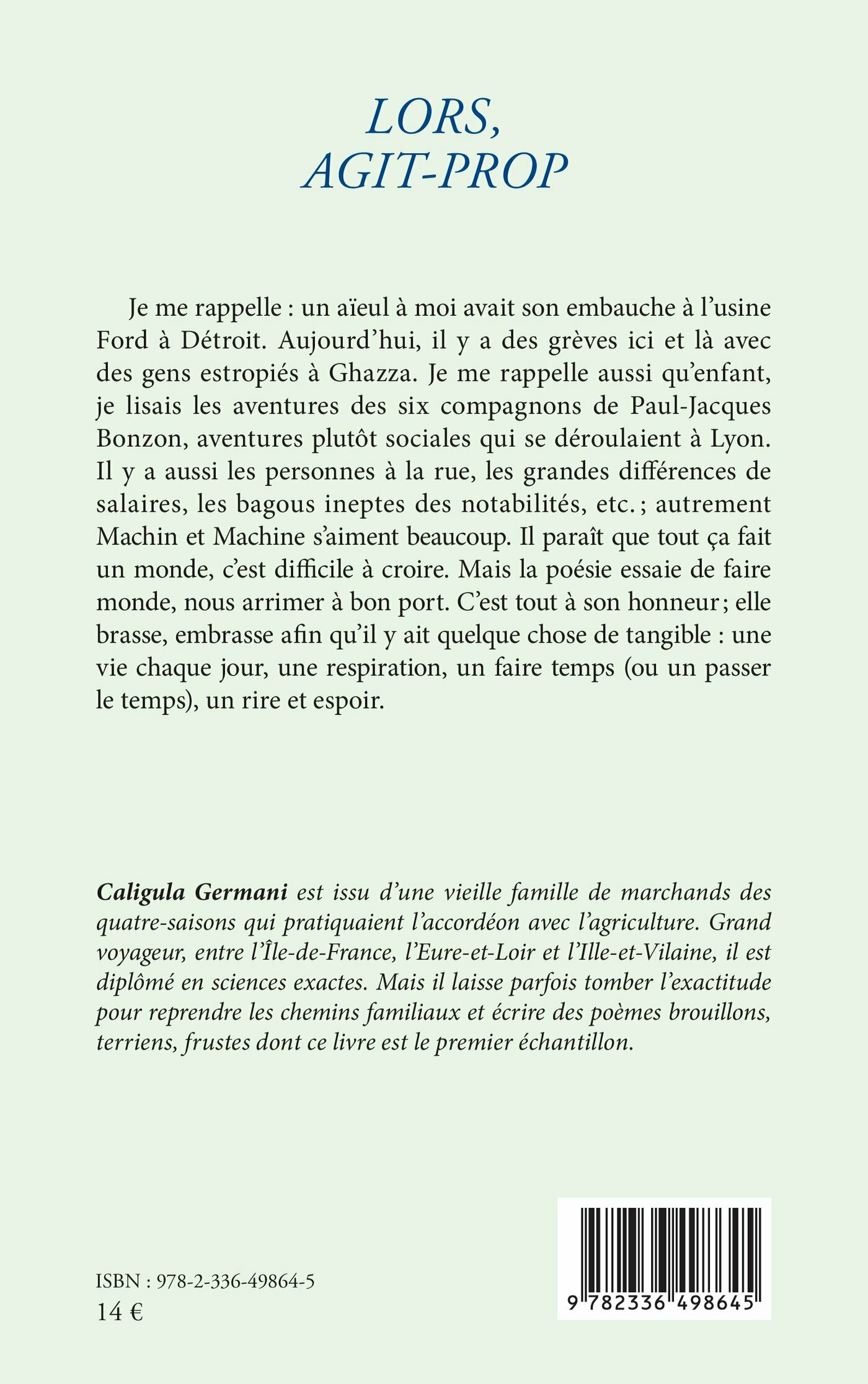 Je me rappelle : un aïeul à moi avait son embauche à l’usine Ford à Détroit. Aujourd’hui, il y a des grèves ici et là avec des gens estropiés à Ghazza. Je me rappelle aussi qu’enfant, je lisais les aventures des six compagnons de Paul-Jacques Bonzon, aventures plutôt sociales qui se déroulaient à Lyon. Il y a aussi les personnes à la rue, les grandes différences de salaires, les bagous ineptes des notabilités, etc. ; autrement Machin et Machine s’aiment beaucoup. Il paraît que tout ça fait un monde, c’est difficile à croire. Mais la poésie essaie de faire monde, nous arrimer à bon port. C’est tout à son honneur ; elle brasse, embrasse afin qu’il y ait quelque chose de tangible : une vie chaque jour, une respiration, un faire temps (ou un passer le temps), un rire et espoir.