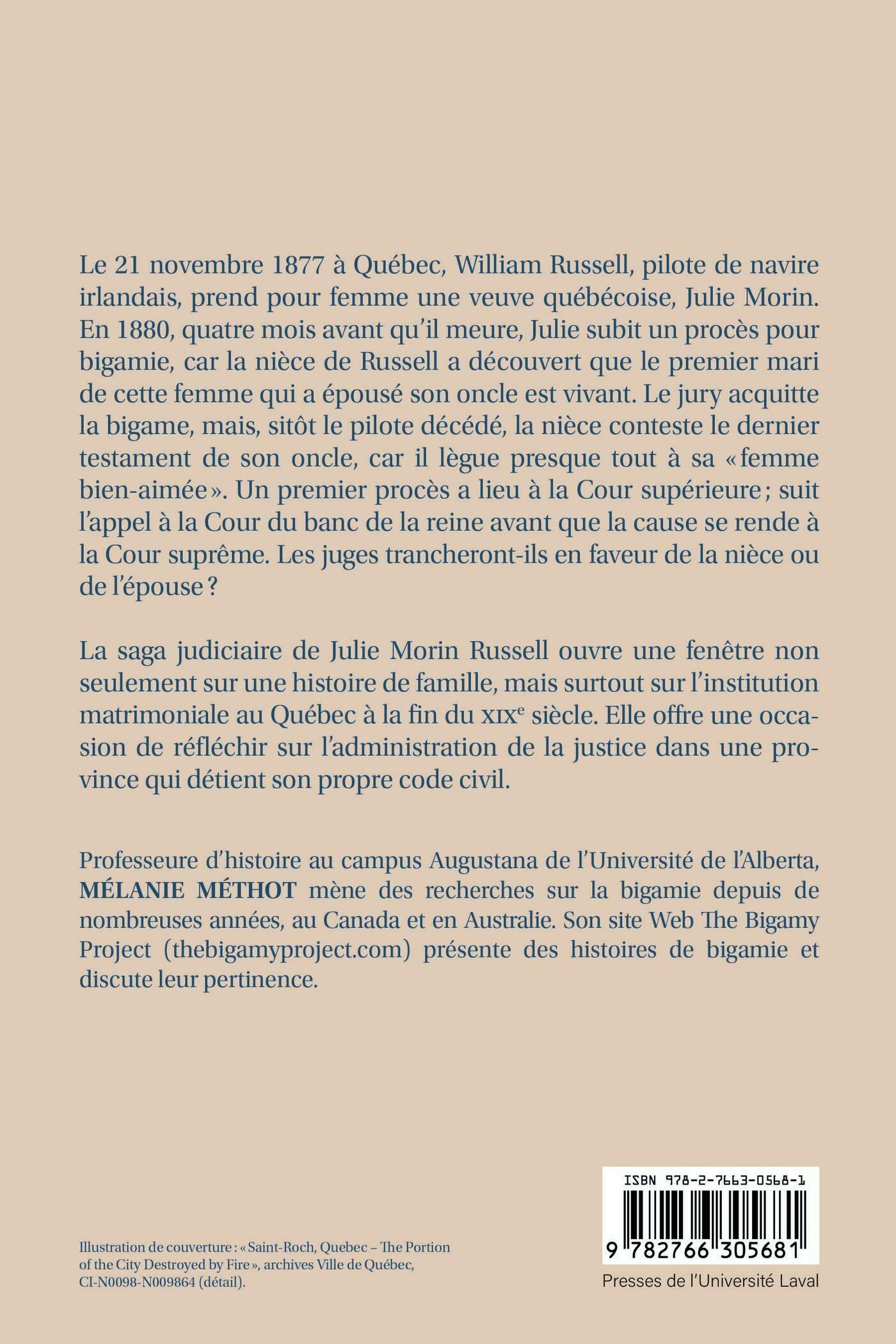 Le 21 novembre 1877 à Québec, William Russell, pilote de navire irlandais, prend pour femme une veuve québécoise, Julie Morin. En 1880, quatre mois avant qu’il meure, Julie subit un procès pour bigamie, car la nièce de Russell a découvert que le premier mari de cette femme qui a épousé son oncle est vivant. Le jury acquitte la bigame, mais, sitôt le pilote décédé, la nièce conteste le dernier testament de son oncle, car il lègue presque tout à sa « femme bien-aimée ». Un premier procès a lieu à la Cour supérieure; suit l’appel à la Cour du banc de la reine avant que la cause se rende à la Cour suprême. Les juges trancheront-ils en faveur de la nièce ou de l’épouse?