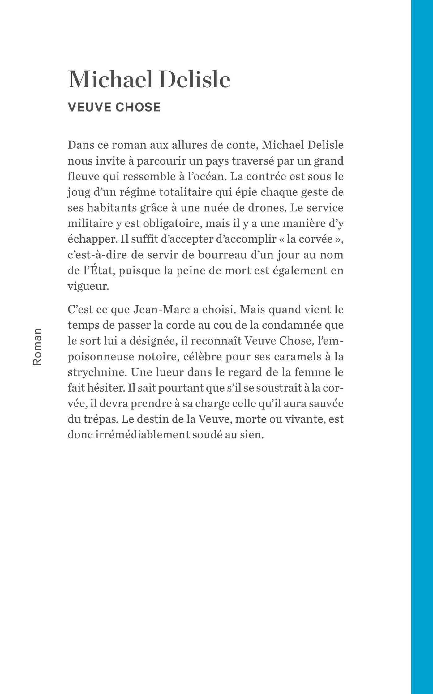 C’est ce que Jean-Marc a choisi. Mais quand vient le temps de passer la corde au cou de la condamnée que le sort lui a désignée, il reconnaît Veuve Chose, l’empoisonneuse notoire, célèbre pour ses caramels à la strychnine. Une lueur dans le regard de la femme le fait hésiter. Il sait pourtant que, s’il se soustrait à la corvée, il devra prendre à sa charge celle qui aura grâce à lui été épargnée. Morte ou vivante, le destin de la Veuve est donc irrémédiablement soudé au sien.