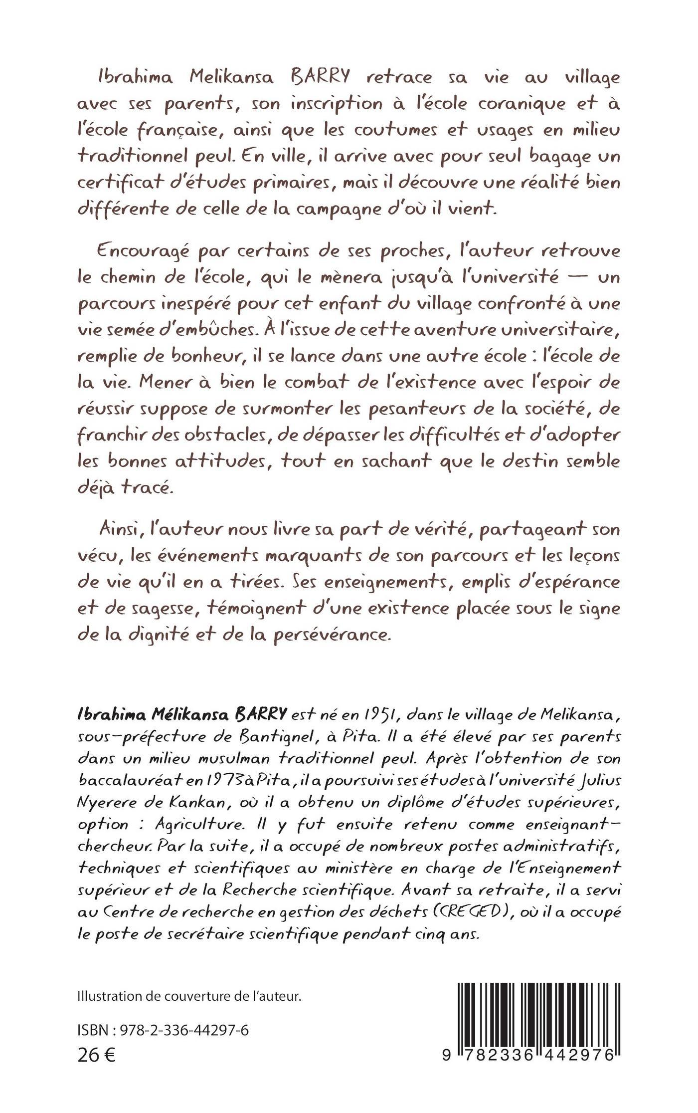 Ibrahima Melikansa BARRY retrace sa vie au village avec ses parents, son inscription à l’école coranique et à l’école française, ainsi que les coutumes et usages en milieu traditionnel peul. En ville, il arrive avec pour seul bagage un certificat d’études primaires, mais il découvre une réalité bien différente de celle de la campagne d’où il vient.