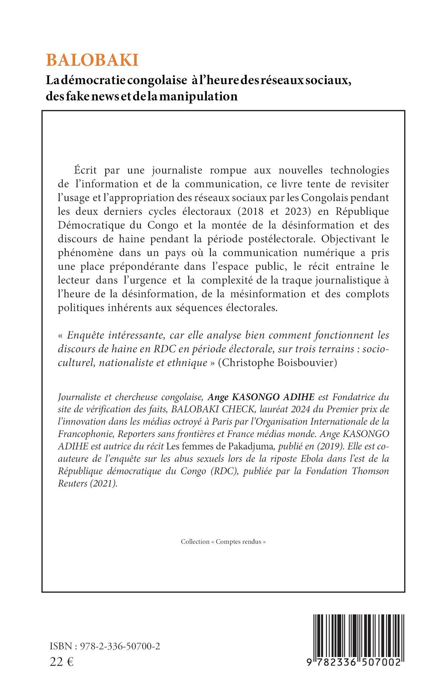 Écrit par une journaliste rompue aux nouvelles technologies de l’information et de la communication, ce livre tente de revisiter l’usage et l’appropriation des réseaux sociaux par les Congolais pendant les deux derniers cycles électoraux (2018 et 2023) en République Démocratique du Congo et la montée de la désinformation et des discours de haine pendant la période postélectorale. Objectivant le phénomène dans un pays où la communication numérique a pris une place prépondérante dans l’espace public, le récit entraîne le lecteur dans l’urgence et la complexité de la traque journalistique à l’heure de la désinformation, de la mésinformation et des complots politiques inhérents aux séquences électorales.