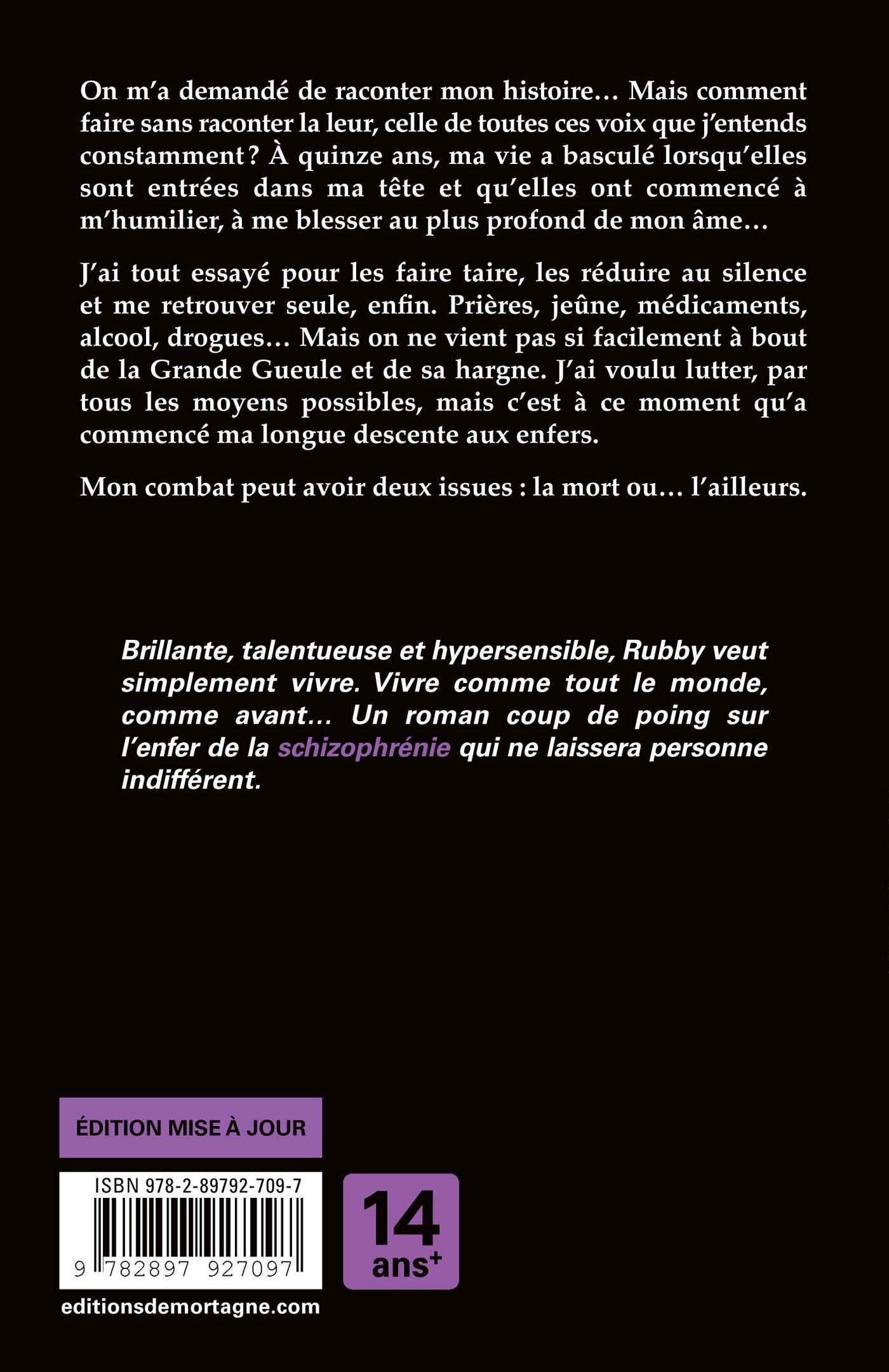 On m’a demandé de raconter mon histoire… Mais comment faire sans raconter la leur, celle de toutes ces voix que j’entends constamment ? À quinze ans, ma vie a basculé lorsqu’elles sont entrées dans ma tête et qu’elles ont commencé à m’humilier, à me blesser au plus profond de mon âme…J’ai tout essayé pour les faire taire, les réduire au silence et me retrouver seule, enfin. Prières, jeûne, médicaments, alcool, drogues… Mais on ne vient pas si facilement à bout de la Grande Gueule et de sa hargne. J’ai voulu lutter, par tous les moyens possibles, mais c’est à ce moment qu’a commencé ma longue descente aux enfers.Mon combat peut avoir deux issues : la mort ou…ailleurs.Brillante, talentueuse et hypersensible, Rubby veut simplement vivre. Vivre comme tout le monde, comme avant… Un roman coup de poing sur l’enfer de la schizophrénie qui ne laissera personne indifférent.