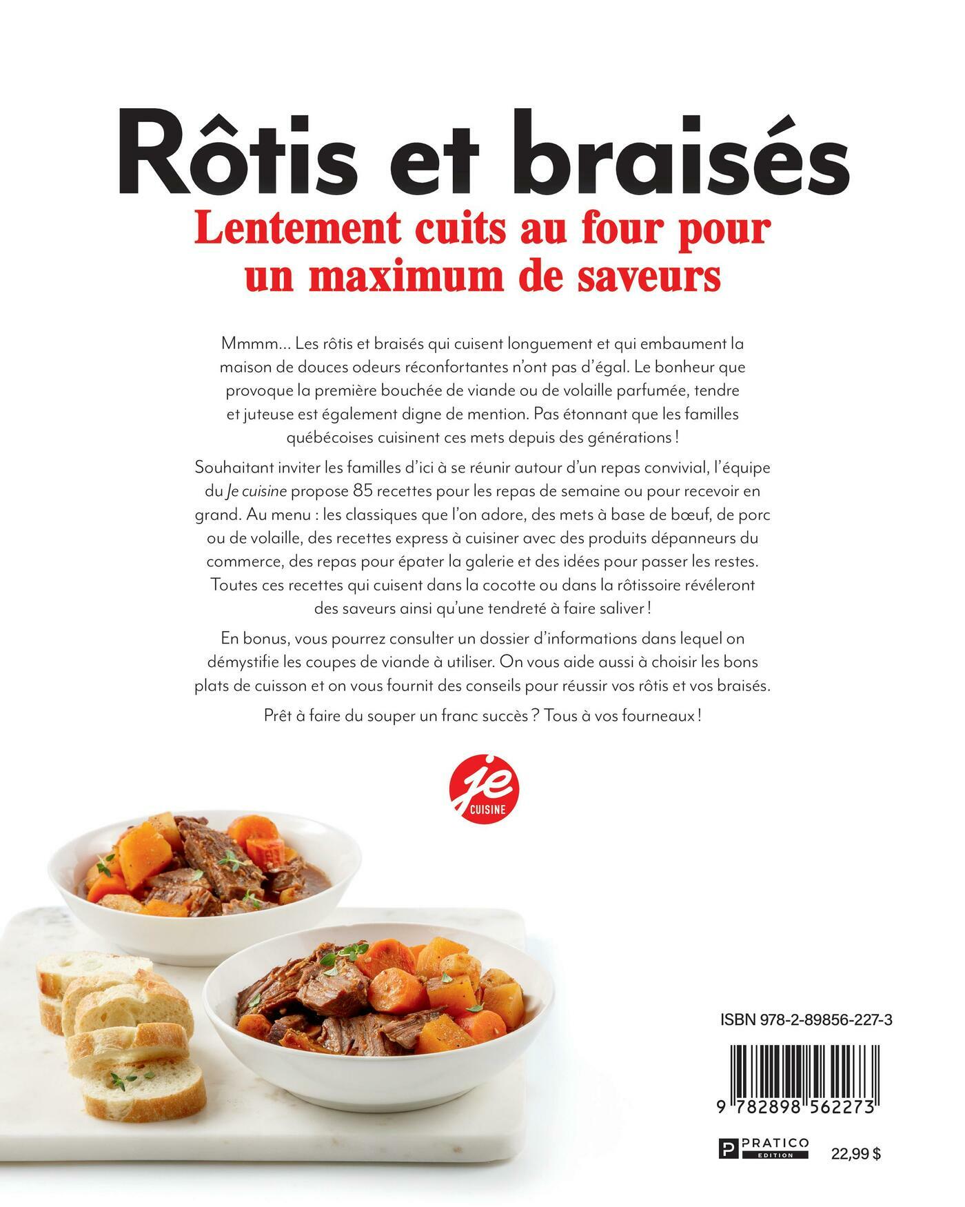 Mmmm… Les rôtis et braisés qui cuisent longuement et qui embaument la maison de douces odeurs réconfortantes n’ont pas d’égal. Le bonheur que provoque la première bouchée de viande ou de volaille parfumée, tendre et juteuse est également digne de mention. Pas étonnant que les familles québécoises cuisinent ces mets depuis des générations !Souhaitant inviter les familles d’ici à se réunir autour d’un repas convivial, l’équipe du Je cuisine propose 85 recettes pour les repas de semaine ou pour recevoir en grand. Au menu : les classiques que l’on adore, des mets à base de boeuf, de porc ou de volaille, des recettes express à cuisiner avec des produits dépanneurs du commerce, des repas pour épater la galerie et des idées pour passer les restes. Toutes ces recettes qui cuisent dans la cocotte ou dans la rôtissoire révéleront des saveurs ainsi qu’une tendreté à faire saliver ! En bonus, vous pourrez consulter un dossier d’informations dans lequel on démystifie les coupes de viande à utiliser. On vous aide aussi à choisir les bons plats de cuisson et on vous fournit des conseils pour réussir vos rôtis et vos braisés.Prêt à faire du souper un franc succès ? Tous à vos fourneaux !