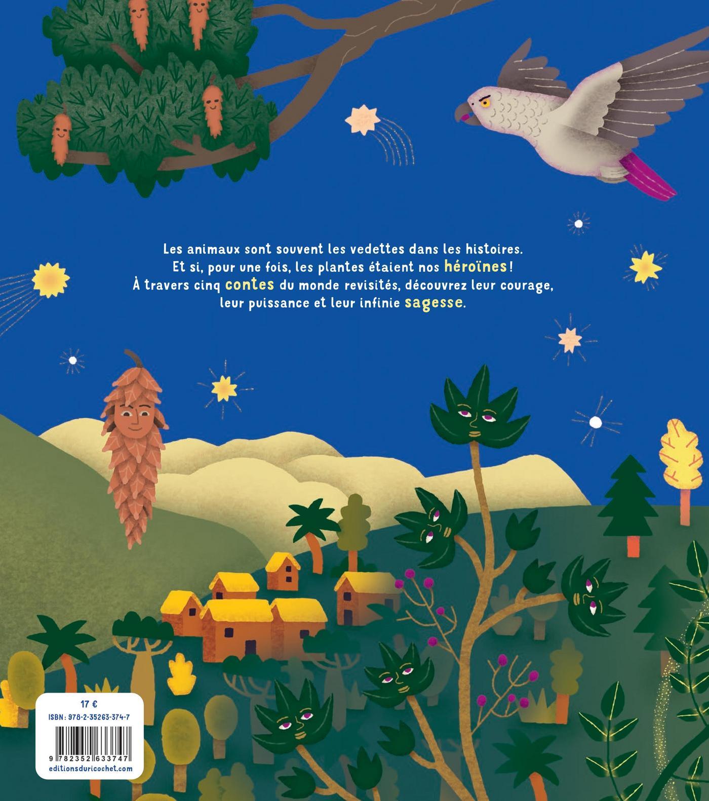 Ce recueil de cinq contes, librement revisités avec modernité, donne la parole à cinq plantes originaires de cinq pays. Avec elles, nous explorons les liens entre le végétal, l'animal, l'humain et même les galaxies !Le voyage commence au Japon avec Momotaro, l'enfant pêche capable de faire pousser du bout de ses doigts des pêches aux pouvoirs extraordinaires. Nous faisons ensuite halte à Madagascar, là où Perroquet, chassé par Source de toute chose, emmena Manioc à la rencontre des Hommes. Un grand palais d'Iran nous ouvre alors ses portes pour y trouver Pastèque, la fille du dragon ! Le chemin continue et nous mène jusqu'en haut d'une colline bulgare pour découvrir Fraxinelle, la plante guérisseuse venue de l'espace. Enfin, dans les forêts québécoises où la guerre fait rage chez les Iroquois, nous accompagnons Pin blanc dans sa quête pour ramener la paix dans le cœur des Hommes.