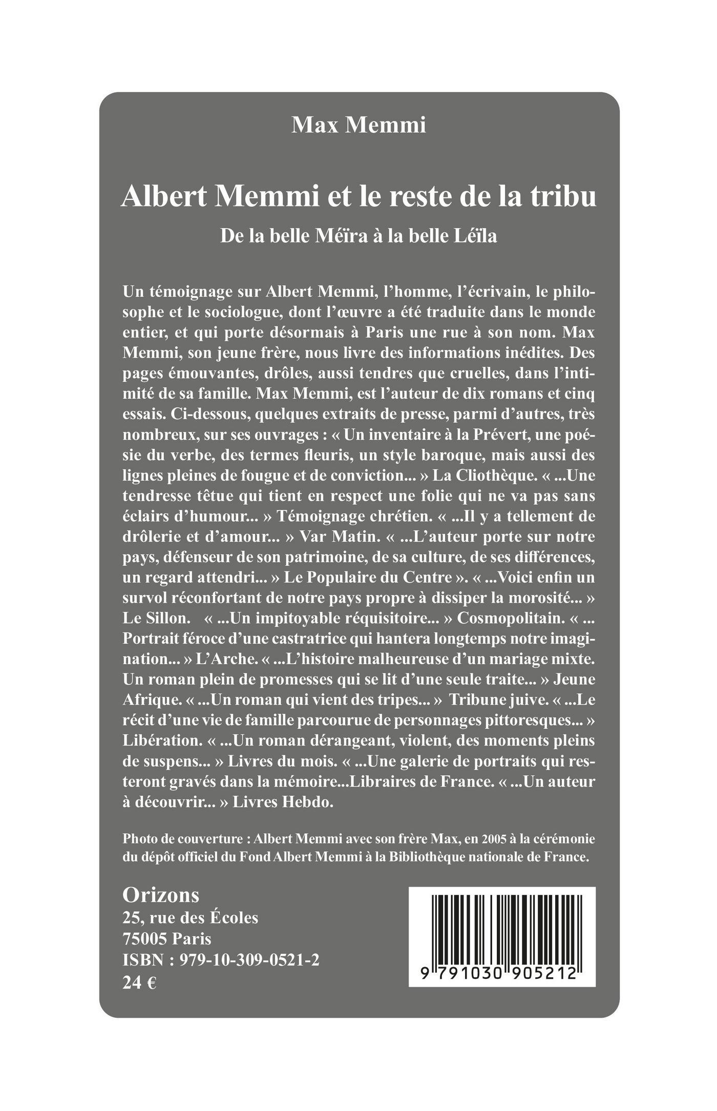 Un témoignage sur Albert Memmi, l’homme, l’écrivain, le philosophe et le sociologue, dont l’œuvre a été traduite dans le monde entier, et qui porte désormais à Paris une rue à son nom. Max Memmi, son jeune frère, nous livre des informations inédites. Des pages émouvantes, drôles, aussi tendres que cruelles, dans l’intimité de sa famille. Max Memmi, est l’auteur de dix romans et cinq essais. Ci-dessous, quelques extraits de presse, parmi d’autres, très nombreux, sur ses ouvrages : « Un inventaire à la Prévert, une poésie du verbe, des termes fleuris, un style baroque, mais aussi des lignes pleines de fougue et de conviction... » La Cliothèque. « ...Une tendresse têtue qui tient en respect une folie qui ne va pas sans éclairs d’humour... » Témoignage chrétien. « ...Il y a tellement de drôlerie et d’amour... » Var Matin. « ...L’auteur porte sur notre pays, défenseur de son patrimoine, de sa culture, de ses différences, un regard attendri... » Le Populaire du Centre ». « ...Voici enfin un survol réconfortant de notre pays propre à dissiper la morosité... » Le Sillon. « ...Un impitoyable réquisitoire... » Cosmopolitain. « ...Portrait féroce d’une castratrice qui hantera longtemps notre imagination... » L’Arche. « ...L’histoire malheureuse d’un mariage mixte. Un roman plein de promesses qui se lit d’une seule traite... » Jeune Afrique. « ...Un roman qui vient des tripes... » Tribune juive. « ...Le récit d’une vie de famille parcourue de personnages pittoresques... » Libération. « ...Un roman dérangeant, violent, des moments pleins de suspens... » Livres du mois. « ...Une galerie de portraits qui resteront gravés dans la mémoire...Libraires de France. « ...Un auteur à découvrir... » Livres Hebdo.