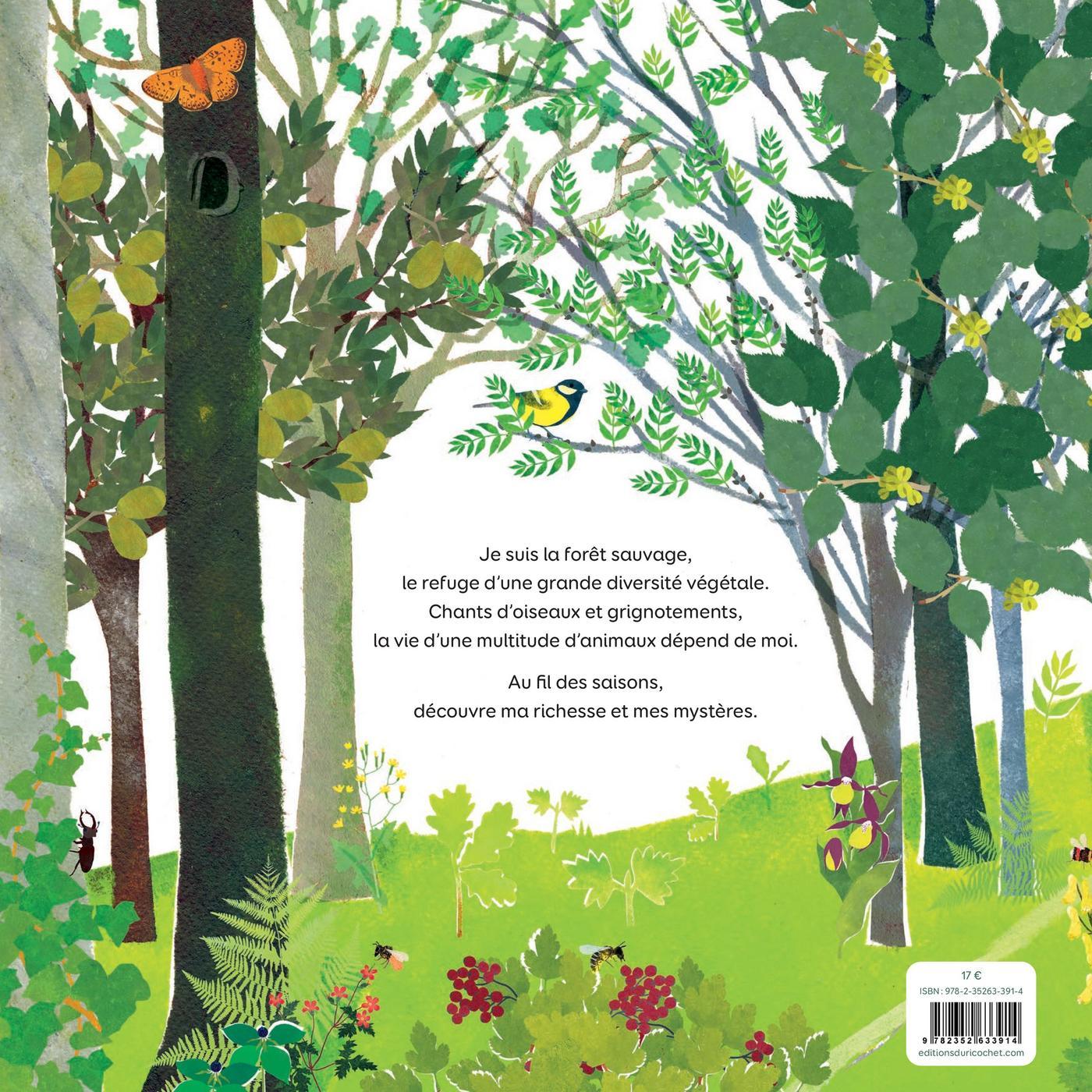 Au cœur de la forêt, plantes, arbres et animaux vivent en toute harmonie au gré des saisons.Au printemps, la forêt se réveille. De petites pousses de fleurs et d'arbres percent la terre, les bourgeons gonflent avant d'éclore. L'été, les feuilles des arbres se gorgent de soleil ! Leur ombre protège un jeune faon des prédateurs.Les arbres changent de couleur en automne, leurs feuilles tapissent le sol et nourrissent la terre et ses habitants.Avec l'hiver, vient le silence, végétaux et petits mammifères se sont endormis. Mais gare au sanglier qui creuse dans la neige et le sol pour trouver à manger !Sous terre, les filaments de champignons et de racines permettent l’échange d’informations et l’entraide.C'est tous ensemble qu'ils maintiennent l'équilibre de la forêt sauvage !