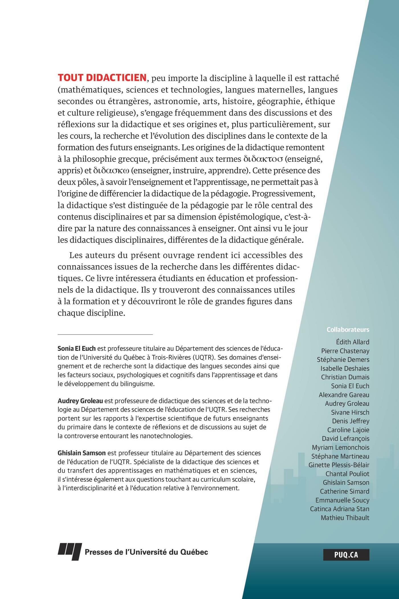 Tout didacticien, peu importe la discipline à laquelle il est rattaché (mathématiques, sciences et technologies, langues maternelles, langues secondes ou étrangères, astronomie, arts, histoire, géographie, éthique et culture religieuse), s’engage fréquemment dans des discussions et des réflexions sur la didactique et ses origines et, plus particulièrement, sur les cours, la recherche et l’évolution des disciplines dans le contexte de la formation des futurs enseignants. Les origines de la didactique remontent à la philosophie grecque, précisément aux termes didaktos (enseigné, appris) et didaskw (enseigner, instruire, apprendre). Cette présence des deux pôles, à savoir l’enseignement et l’apprentissage, ne permettait pas à l’origine de différencier la didactique de la pédagogie. Progressivement, la didactique s’est distinguée de la pédagogie par le rôle central des contenus disciplinaires et par sa dimension épistémologique, c’est-à-dire par la nature des connaissances à enseigner. Ont ainsi vu le jour les didactiques disciplinaires, différentes de la didactique générale.Les auteurs du présent ouvrage rendent ici accessibles des connaissances issues de la recherche dans les différentes didactiques. Ce livre intéressera étudiants en éducation et professionnels de la didactique. Ils y trouveront des connaissances utiles à la formation et y découvriront le rôle de grandes figures dans chaque discipline.