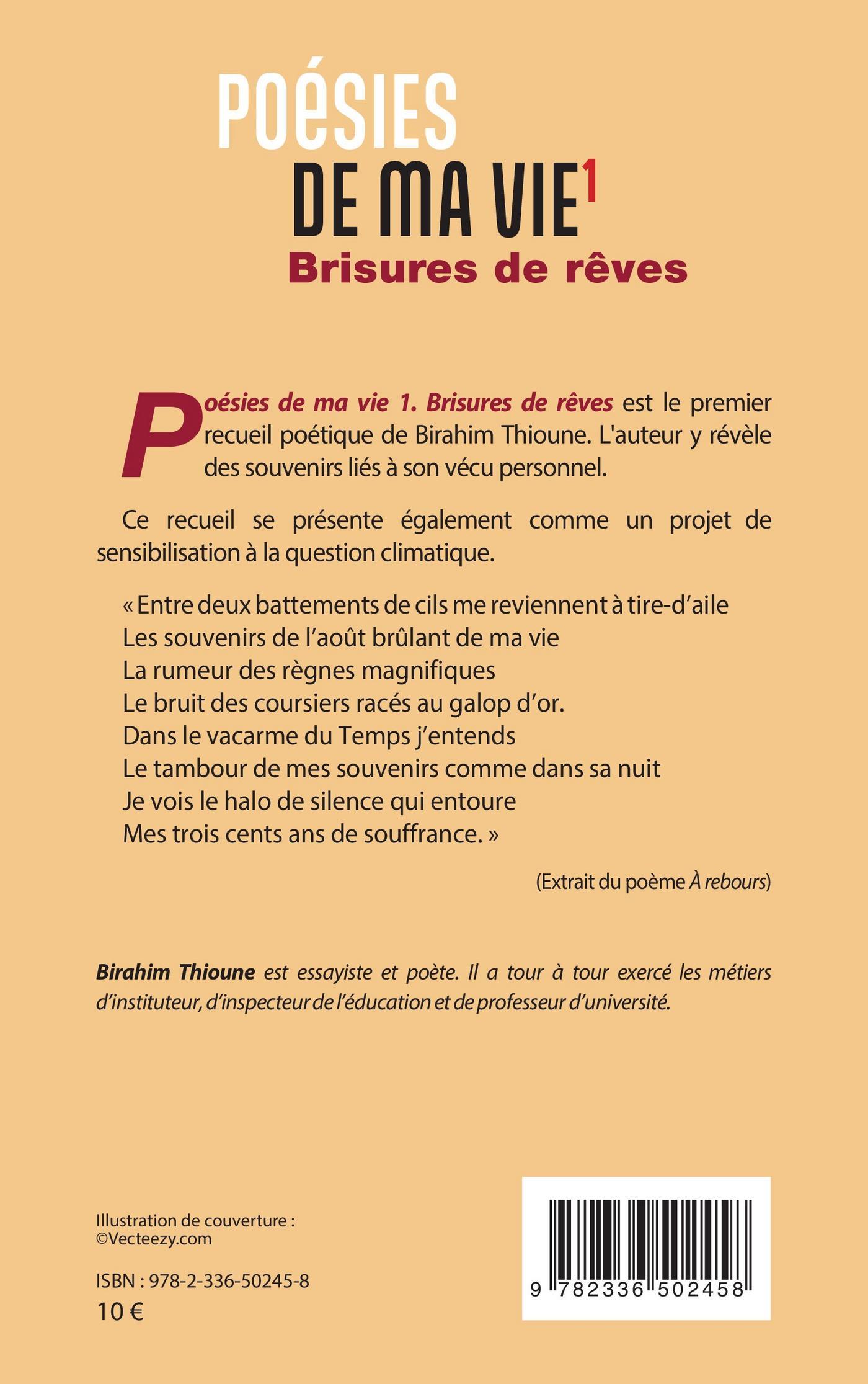 Poésies de ma vie 1. Brisures de rêves est le premier recueil poétique de Birahim Thioune. L'auteur y révèle des souvenirs liés à son vécu personnel.