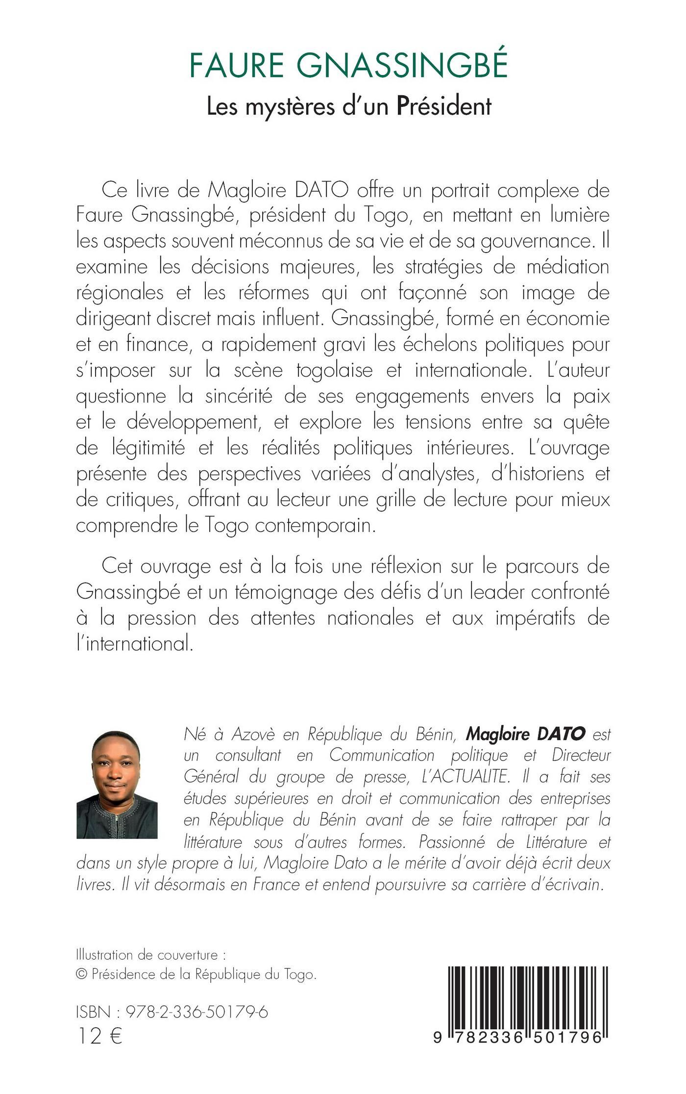 Ce livre de Magloire DATO offre un portrait complexe de Faure Gnassingbé, président du Togo, en mettant en lumière les aspects souvent méconnus de sa vie et de sa gouvernance. Il examine les décisions majeures, les stratégies de médiation régionales et les réformes qui ont façonné son image de dirigeant discret mais influent. Gnassingbé, formé en économie et en finance, a rapidement gravi les échelons politiques pour s’imposer sur la scène togolaise et internationale. L’auteur questionne la sincérité de ses engagements envers la paix et le développement, et explore les tensions entre sa quête de légitimité et les réalités politiques intérieures. L’ouvrage présente des perspectives variées d’analystes, d’historiens et de critiques, offrant au lecteur une grille de lecture pour mieux comprendre le Togo contemporain.