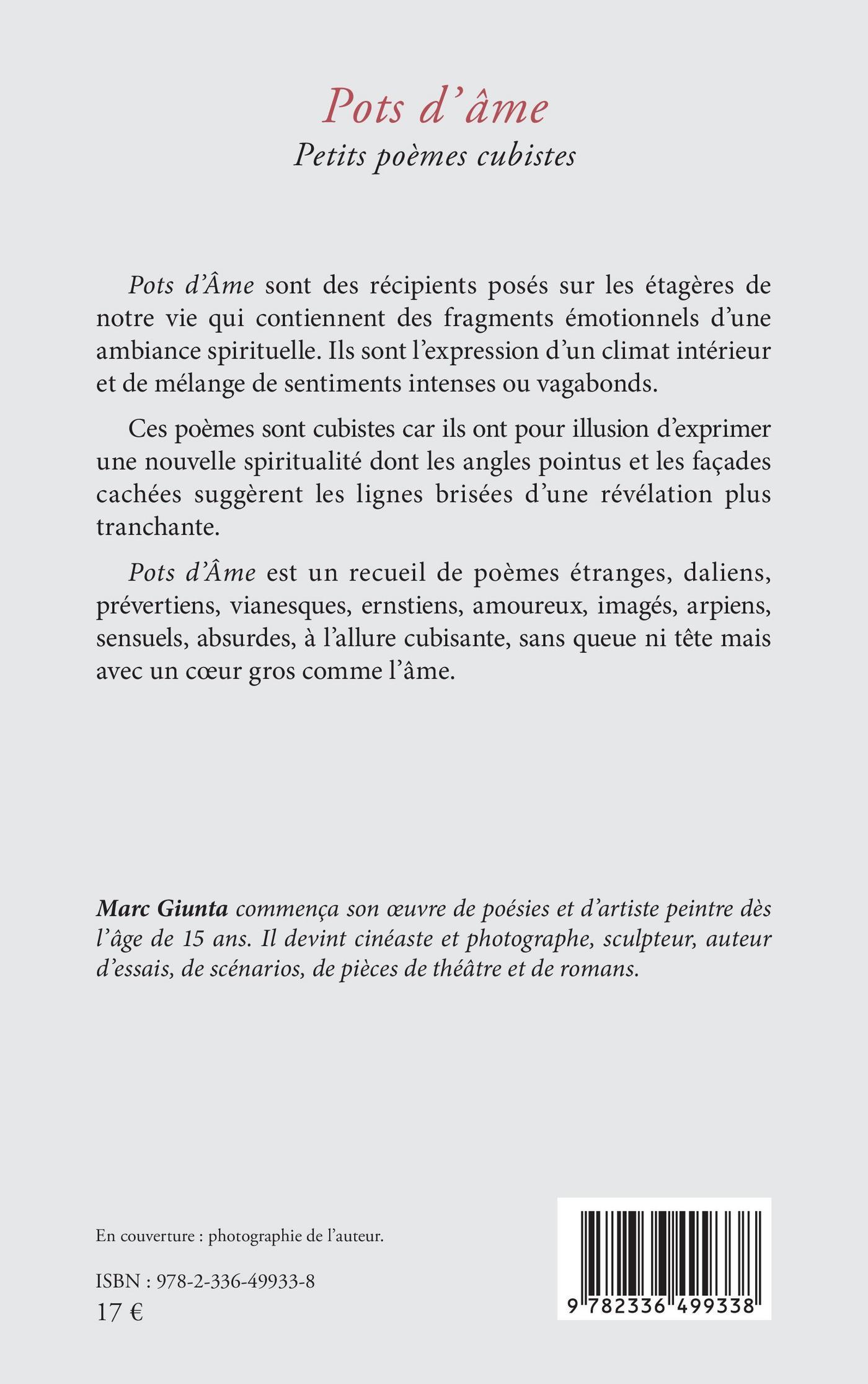 Pots d’Âme est un recueil de poèmes étranges, daliens, prévertiens, vianesques, ernstiens, amoureux, imagés, arpiens, sensuels, absurdes, à l’allure cubisante, sans queue ni tête mais avec un cœur gros comme l’âme.