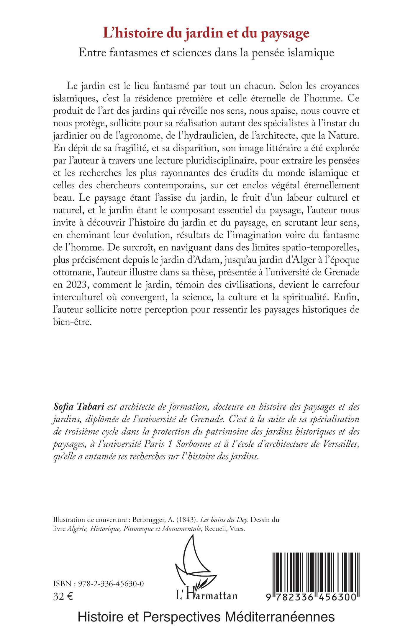 Le jardin est le lieu fantasmé par tout un chacun. Selon les croyances islamiques, c’est la résidence première et celle éternelle de l’homme. Ce produit de l’art des jardins qui réveille nos sens, nous apaise, nous couvre et nous protège, sollicite pour sa réalisation autant des spécialistes à l’instar du jardinier ou de l’agronome, de l’hydraulicien, de l’architecte, que la Nature. En dépit de sa fragilité, et sa disparition, son image littéraire a été explorée par l’auteur à travers une lecture pluridisciplinaire, pour extraire les pensées et les recherches les plus rayonnantes des érudits du monde islamique et celles des chercheurs contemporains, sur cet enclos végétal éternellement beau. Le paysage étant l’assise du jardin, le fruit d’un labeur culturel et naturel, et le jardin étant le composant essentiel du paysage, l’auteur nous invite à découvrir l’histoire du jardin et du paysage, en scrutant leur sens, en cheminant leur évolution, résultats de l’imagination voire du fantasme de l’homme. De surcroît, en naviguant dans des limites spatio-temporelles, plus précisément depuis le jardin d’Adam, jusqu’au jardin d’Alger à l’époque ottomane, l’auteur illustre dans sa thèse, présentée à l’université de Grenade en 2023, comment le jardin, témoin des civilisations, devient le carrefour interculturel où convergent, la science, la culture et la spiritualité. Enfin, l’auteur sollicite notre perception pour ressentir les paysages historiques de bien-être.