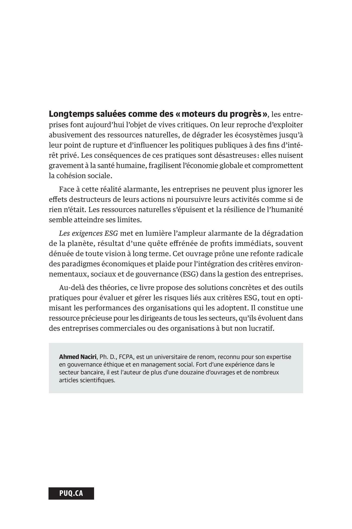 Longtemps saluées comme des « moteurs du progrès », les entreprises font aujourd’hui l’objet de vives critiques. On leur reproche d’exploiter abusivement des ressources naturelles, de dégrader les écosystèmes jusqu’à leur point de rupture et d’influencer les politiques publiques à des fins d’intérêt privé. Les conséquences de ces pratiques sont désastreuses : elles nuisent gravement à la santé humaine, fragilisent l’économie globale et compromettent la cohésion sociale.Face à cette réalité alarmante, les entreprises ne peuvent plus ignorer les effets destructeurs de leurs actions ni poursuivre leurs activités comme si de rien n’était. Les ressources naturelles s’épuisent et la résilience de l’humanité semble atteindre ses limites.Les exigences ESG met en lumière l’ampleur alarmante de la dégradation de la planète, résultat d’une quête effrénée de profits immédiats, souvent dénuée de toute vision à long terme. Cet ouvrage prône une refonte radicale des paradigmes économiques et plaide pour l’intégration des critères environnementaux, sociaux et de gouvernance (ESG) dans la gestion des entreprises.Au-delà des théories, ce livre propose des solutions concrètes et des outils pratiques pour évaluer et gérer les risques liés aux critères ESG, tout en optimisant les performances des organisations qui les adoptent. Il constitue une ressource précieuse pour les dirigeants de tous les secteurs, qu’ils évoluent dans des entreprises commerciales ou des organisations à but non lucratif.