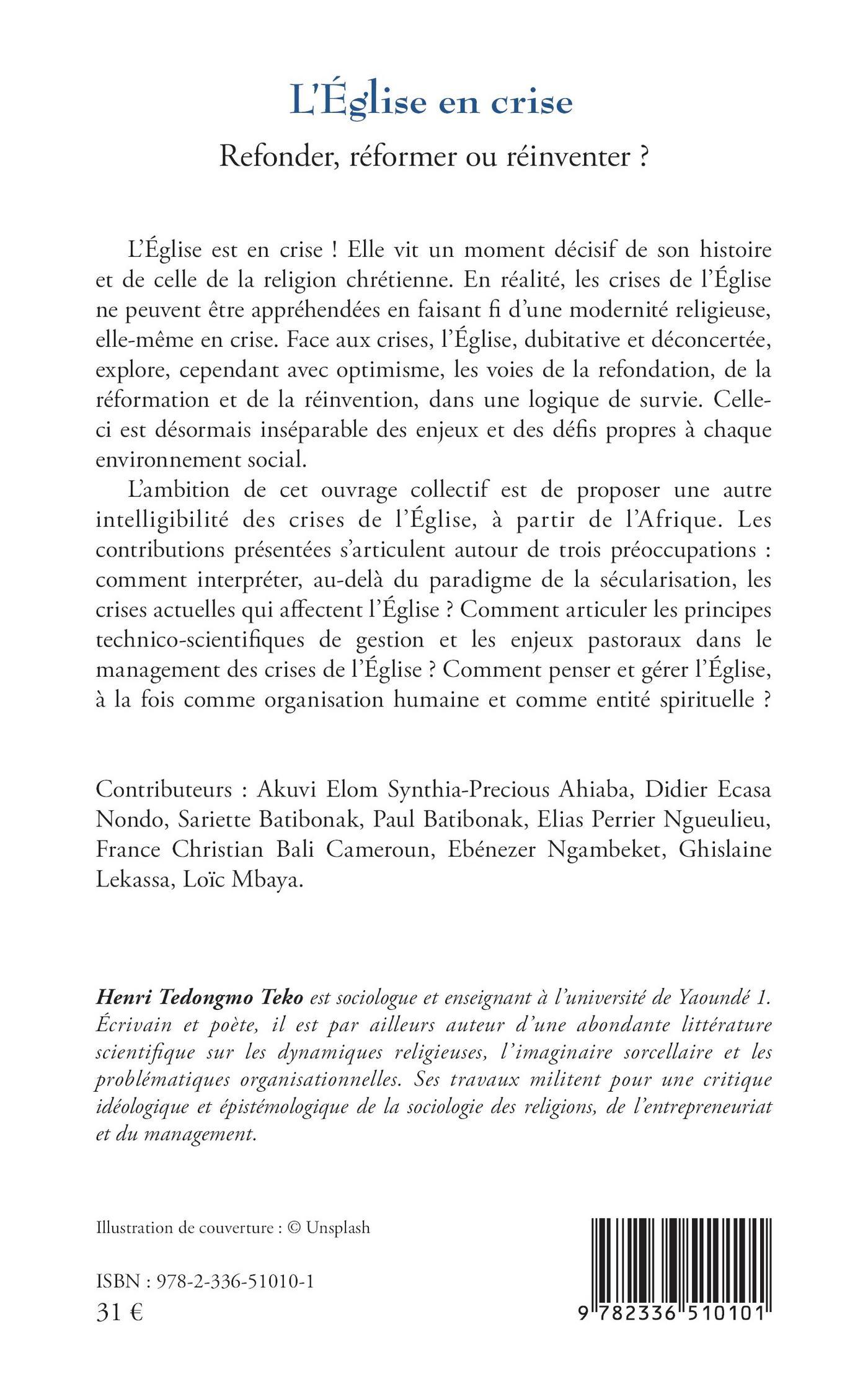 L’Église est en crise ! Elle vit un moment décisif de son histoire et de celle de la religion chrétienne. En réalité, les crises de l’Église ne peuvent être appréhendées en faisant fi d’une modernité religieuse, elle-même en crise. Face aux crises, l’Église, dubitative et déconcertée, explore, cependant avec optimisme, les voies de la refondation, de la réformation et de la réinvention, dans une logique de survie. Celle-ci est désormais inséparable des enjeux et des défis propres à chaque environnement social.