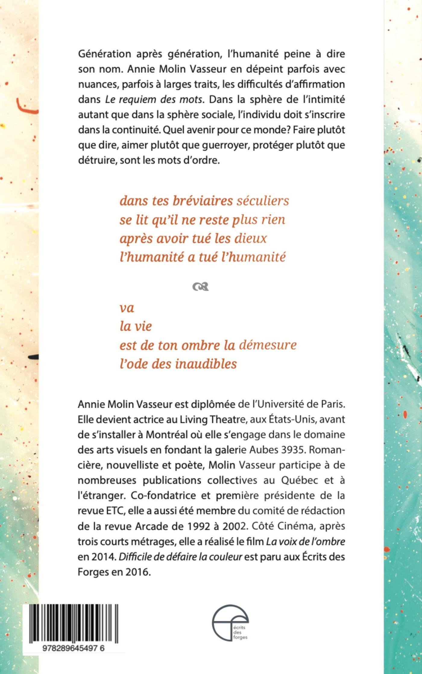 Génération après génération, l’humanité peine à dire son nom. Annie Molin Vasseur en dépeint parfois avec nuances, parfois à larges traits, les difficultés d’affirmation dans son nouveau recueil de poésie, Le requiem des mots. Dans la sphère de l’intimité autant que dans la sphère sociale, l’individu doit s’inscrire dans la continuité.
