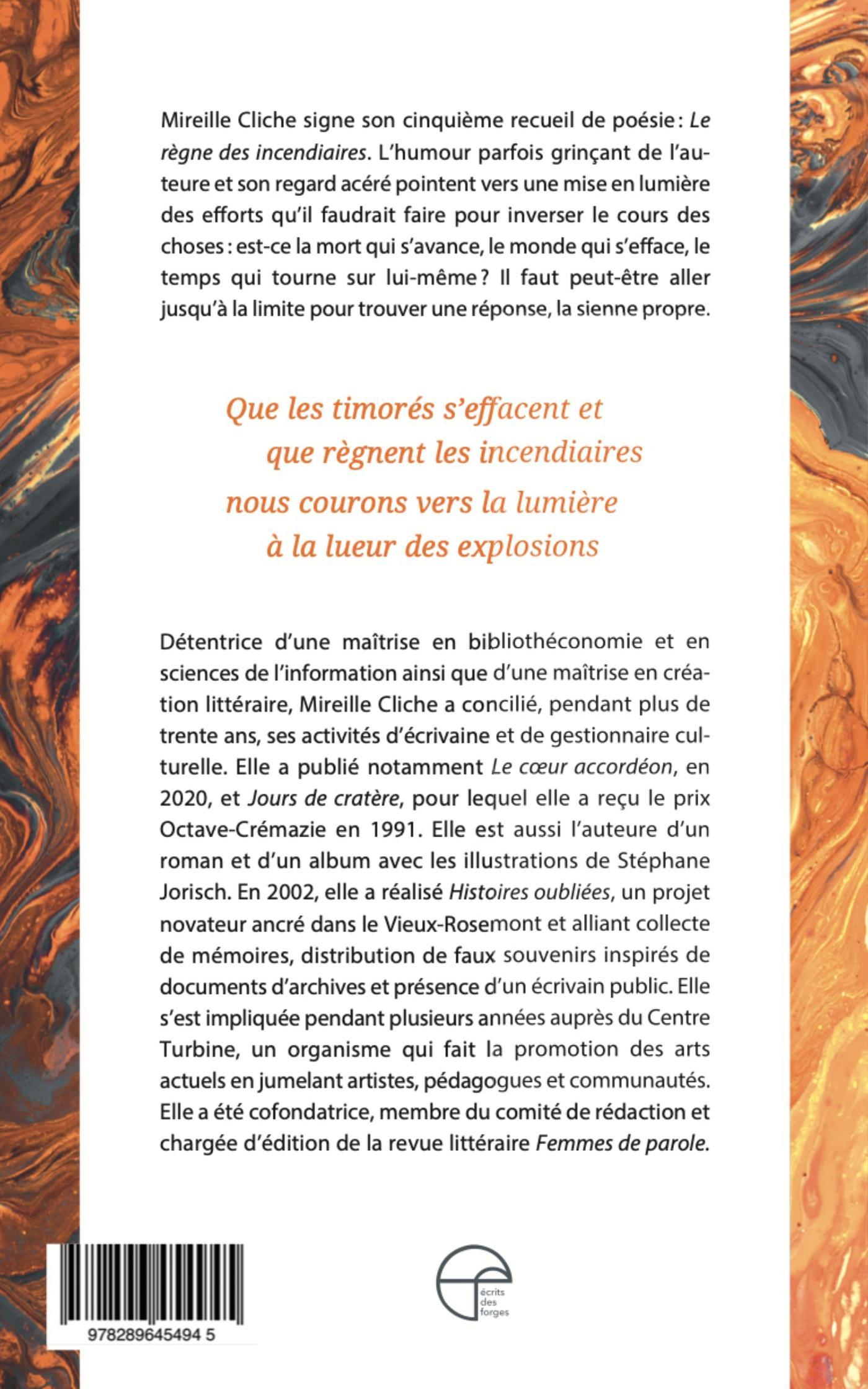 D’entrée de jeu, il faut souligner la perspicacité du regard, l’acuité des images, l’à-propos des points de vue de la poète, Mireille Cliche, qui signe ici son cinquième recueil de poésie intitulé Le règne des incendiaires. Lucide, la narratrice soutient l’affirmation de son titre dès le premier poème : « Que les timorés s’effacent et que règnent les incendiaires / nous courons vers la lumière à la lueur des explosions ».