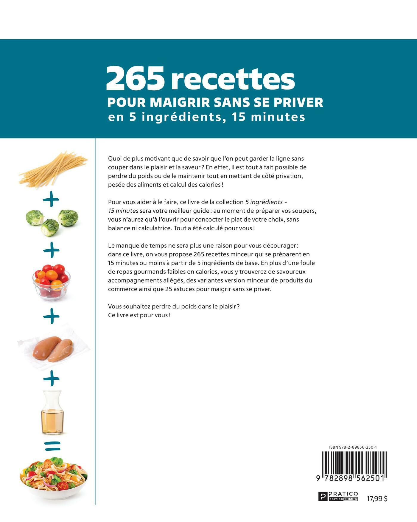 Quoi de plus motivant que de savoir que l’on peut garder la ligne sans couper dans le plaisir et la saveur ? En effet, il est tout à fait possible de perdre du poids ou de le maintenir tout en mettant de côté privation, pesée des aliments et calcul des calories ! Pour vous aider à le faire, ce livre de la collection 5 ingrédients - 15 minutes sera votre meilleur guide : au moment de préparer vos soupers, vous n’aurez qu’à l’ouvrir pour concocter le plat de votre choix, sans balance ni calculatrice. Tout a été calculé pour vous ! Le manque de temps ne sera plus une raison pour vous décourager : dans ce livre, on vous propose 265 recettes minceur qui se préparent en 15 minutes ou moins à partir de 5 ingrédients de base. En plus d’une foule de repas gourmands faibles en calories, vous y trouverez de savoureux accompagnements allégés, des variantes version minceur de produits du commerce ainsi que 25 astuces pour maigrir sans se priver. Vous souhaitez perdre du poids dans le plaisir ? Ce livre est pour vous !